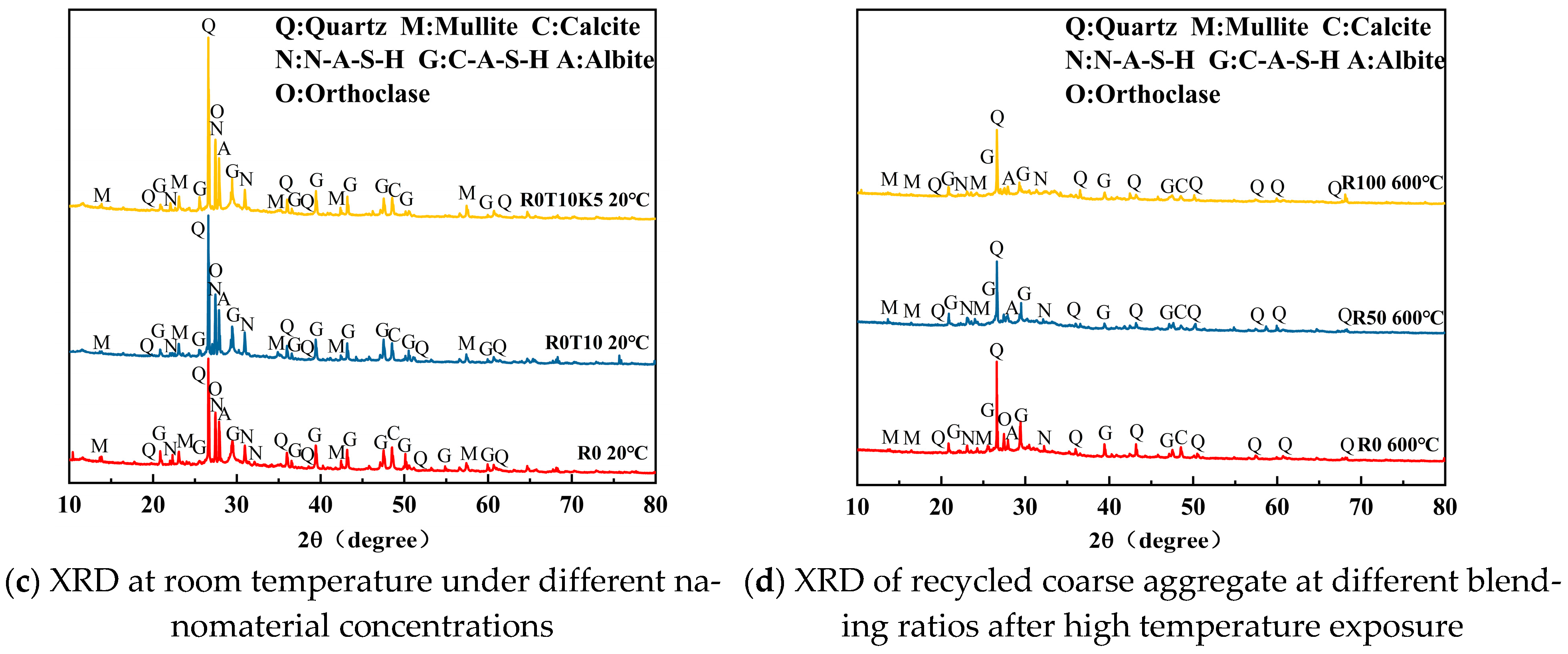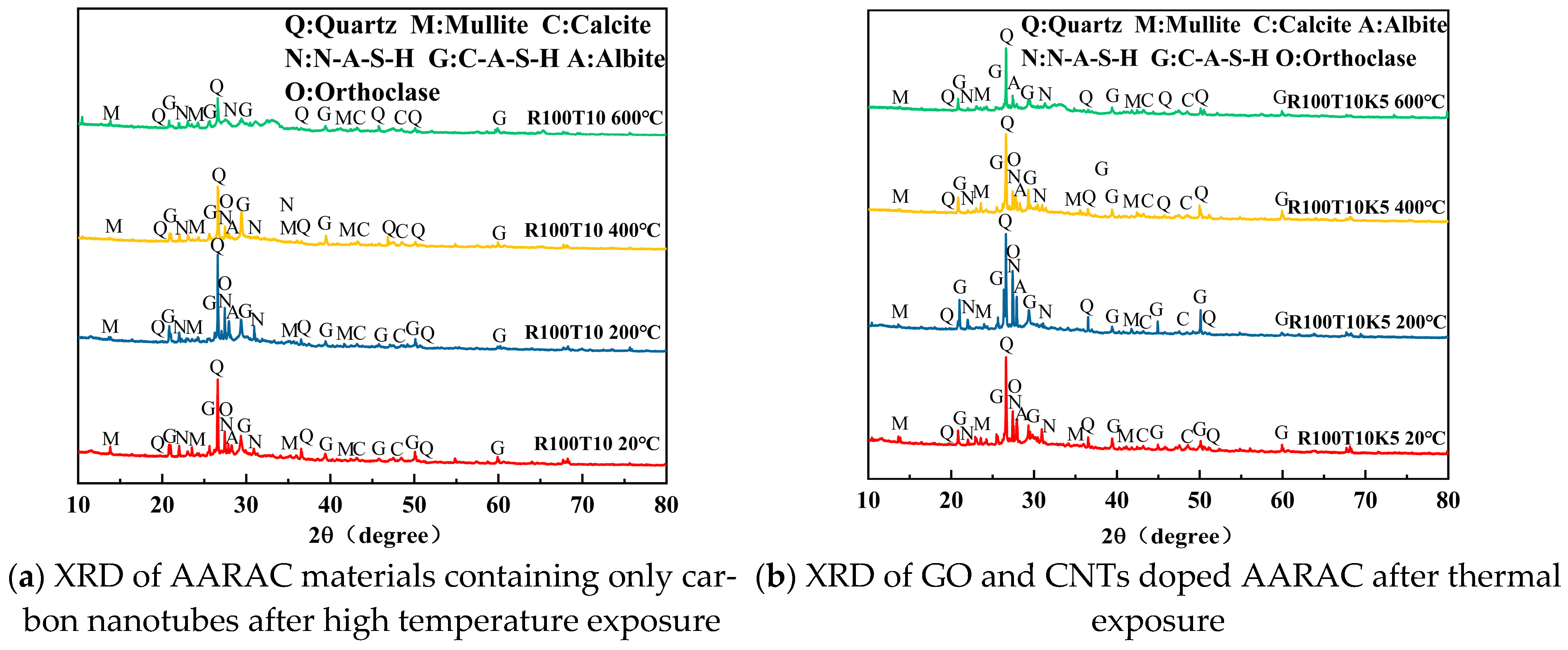 - Analysis indicates that the phase composition of AARAC after different temperature treatments is similar. As the temperature increases, the peak intensities of the C-A-S-H gel and N-A-S-H gel features show a trend of increasing at first and then decreasing. The incorporation of nanomaterials can increase the peak values of the gel features and effectively inhibit the gel decomposition caused by high temperature. SEM testing shows that the nanomaterials CNTs and GO improve the microstructure of the AARAC specimen through bridging and filling effects, significantly enhancing the compactness of the ITZ. After high-temperature exposure, the special cross-linked structure formed by nanomaterials CNTs and GO with gel is not completely destroyed, effectively maintaining the macroscopic mechanical properties and structural integrity of the specimens.
