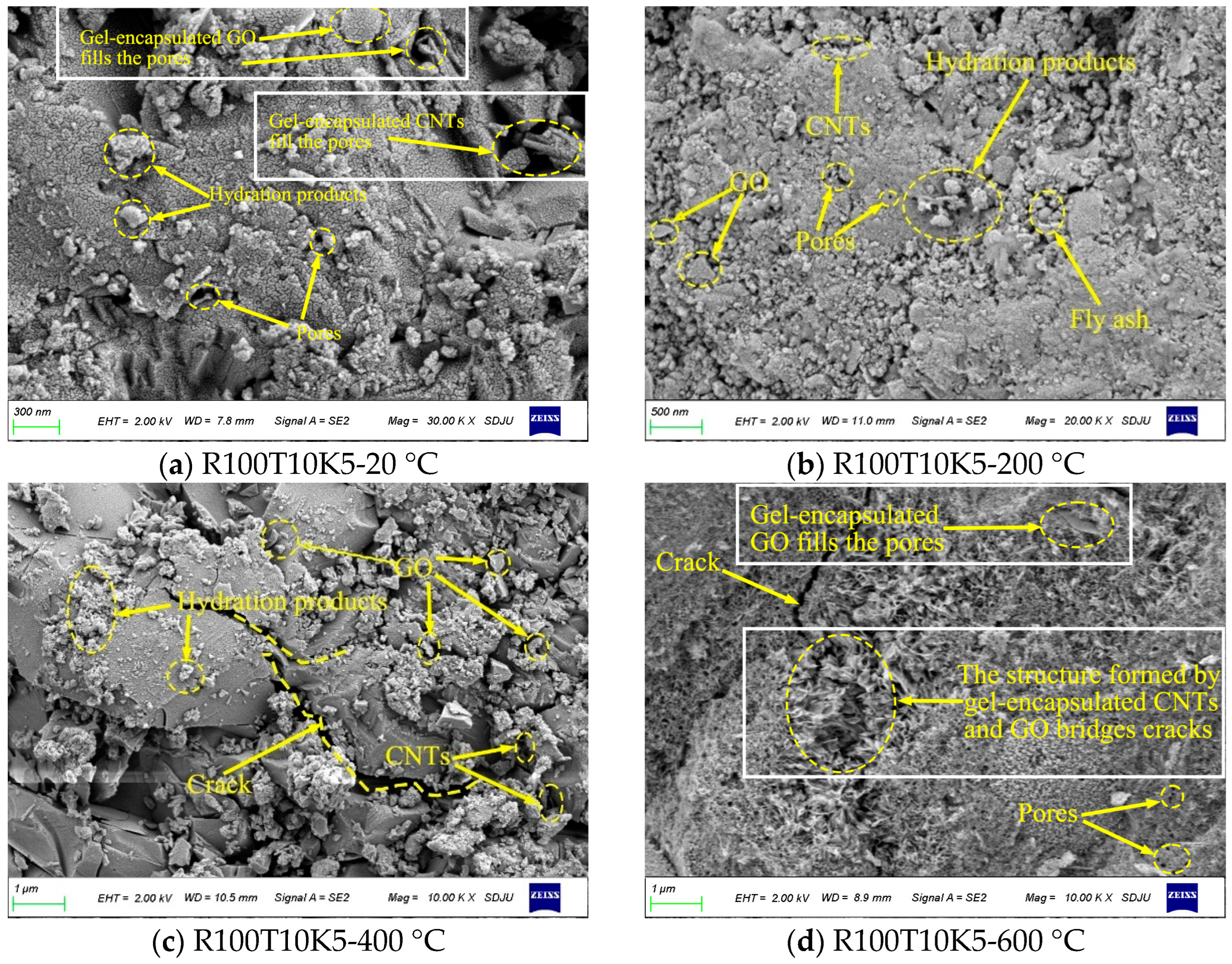 - Zhang, L.; Kai, M.; Liew, K. Evaluation of microstructure and mechanical performance of CNT-reinforced cementitious composites at elevated temperatures. Compos. Part A Appl. Sci. Manuf. 2017, 95, 286–293. [Google Scholar] [CrossRef]