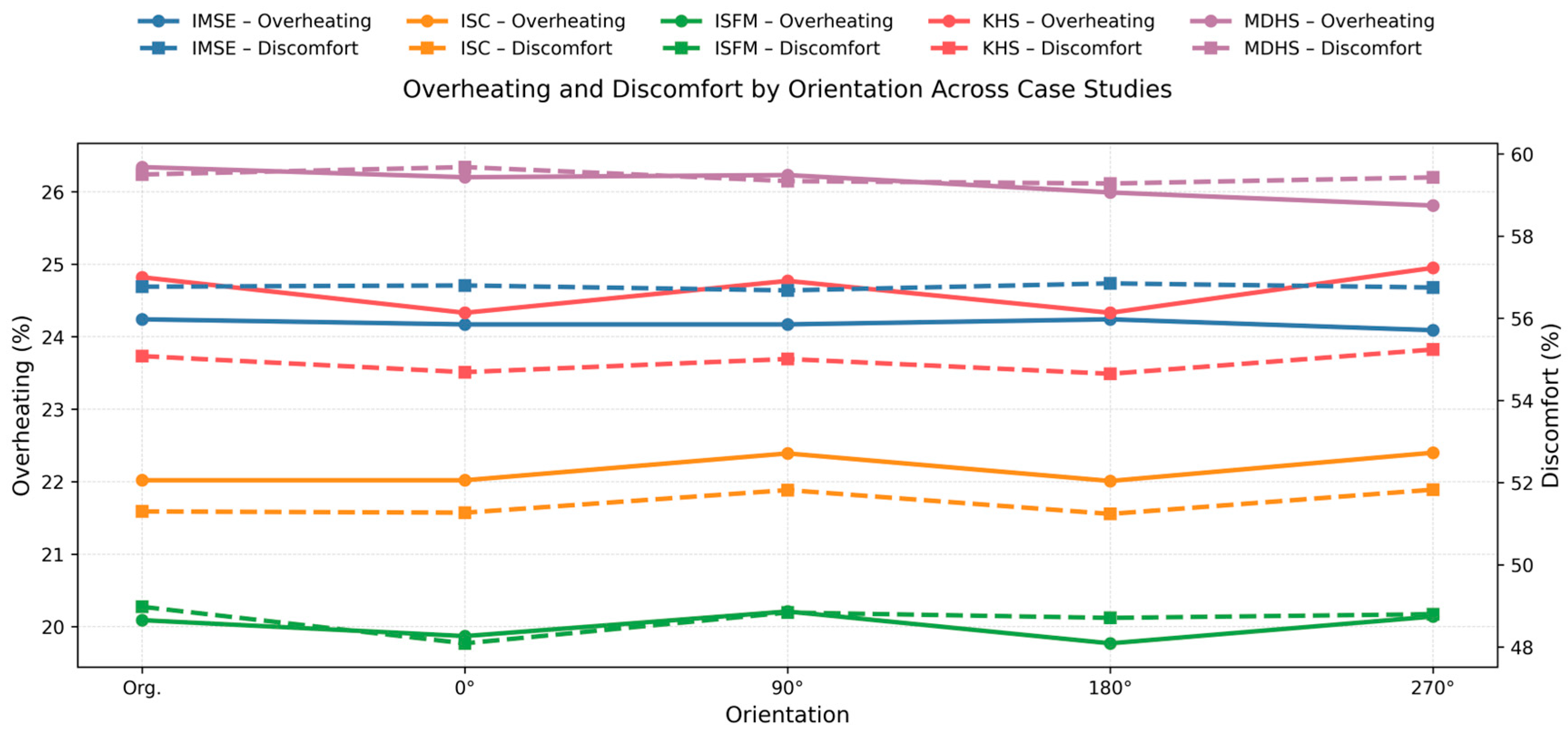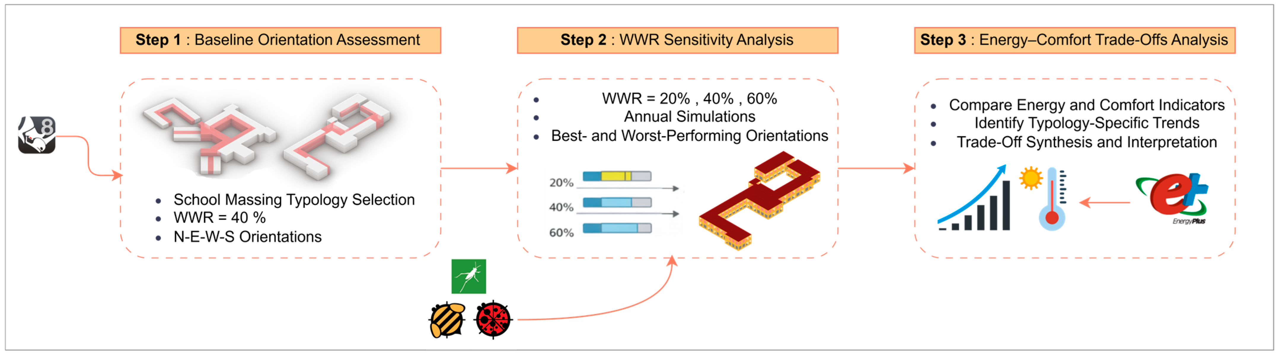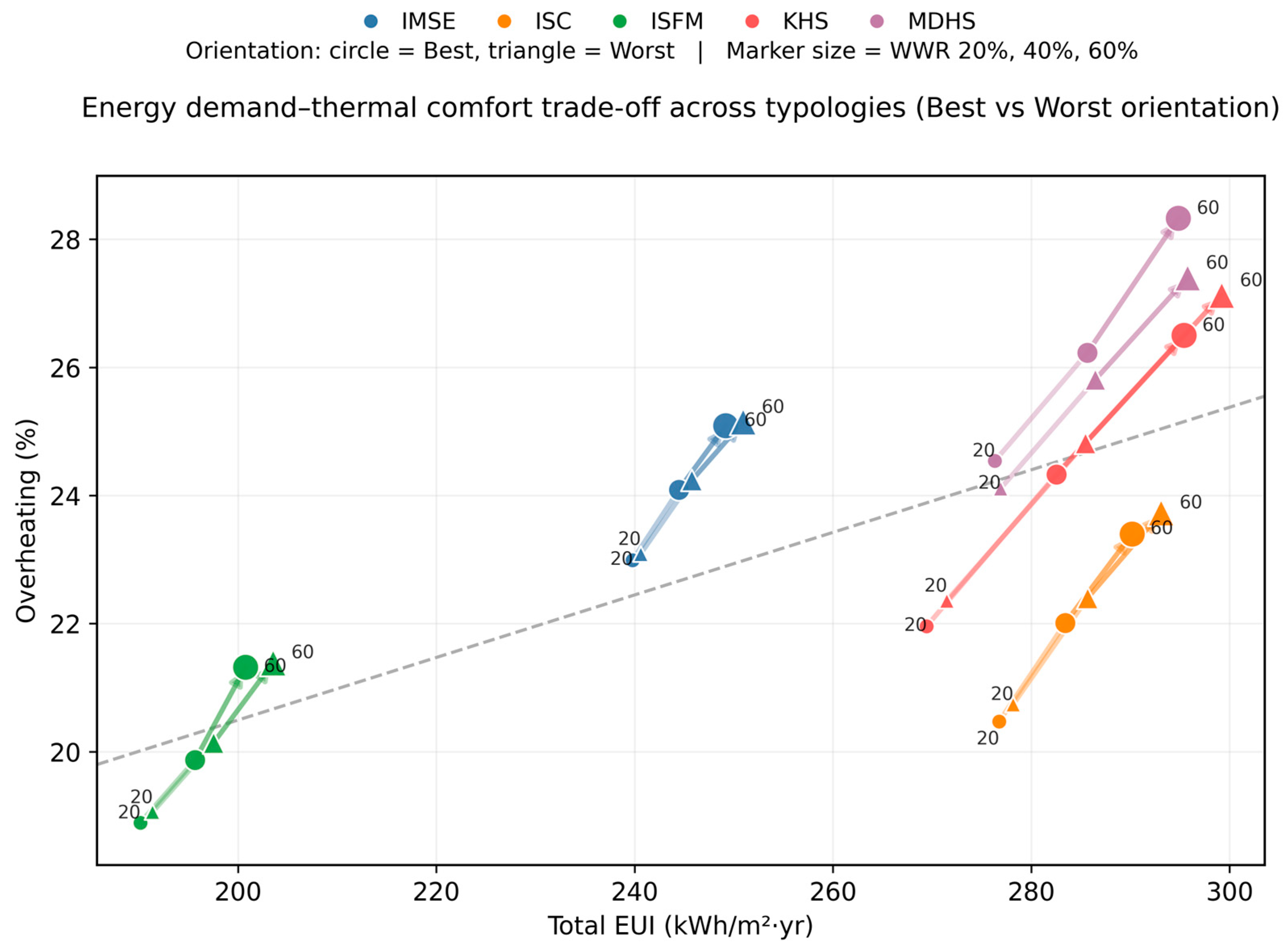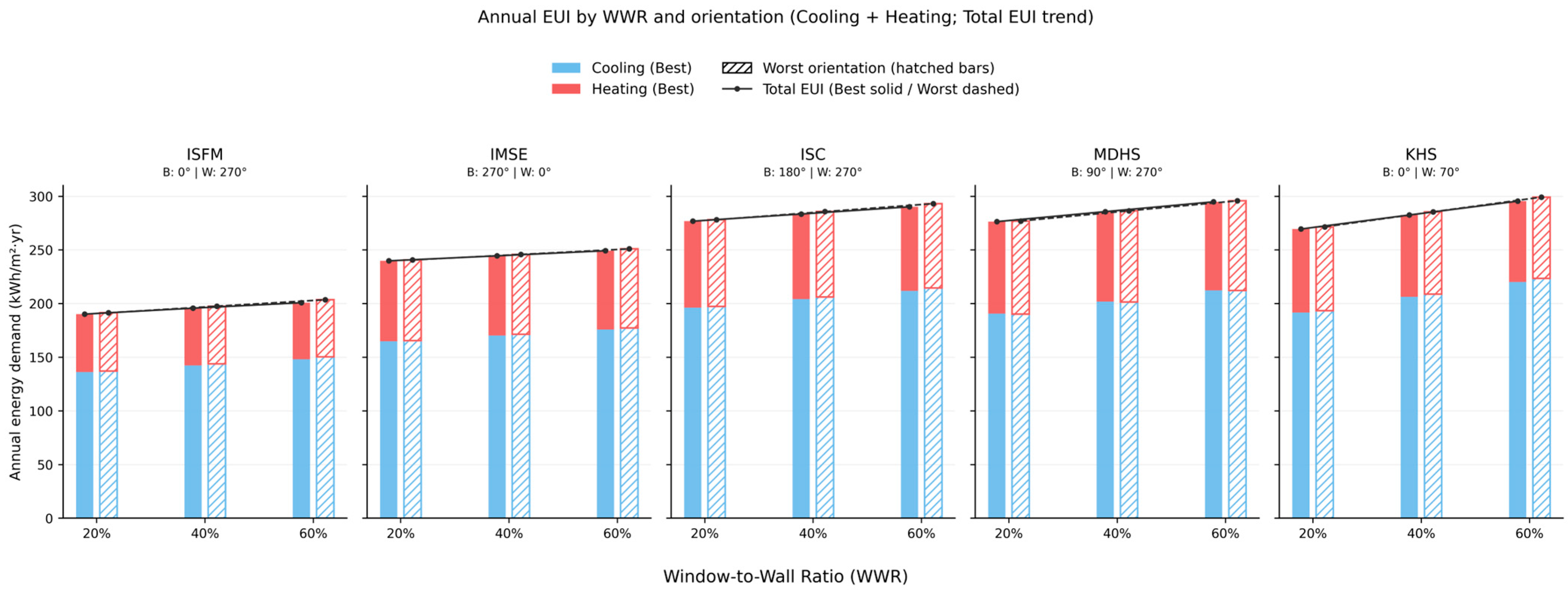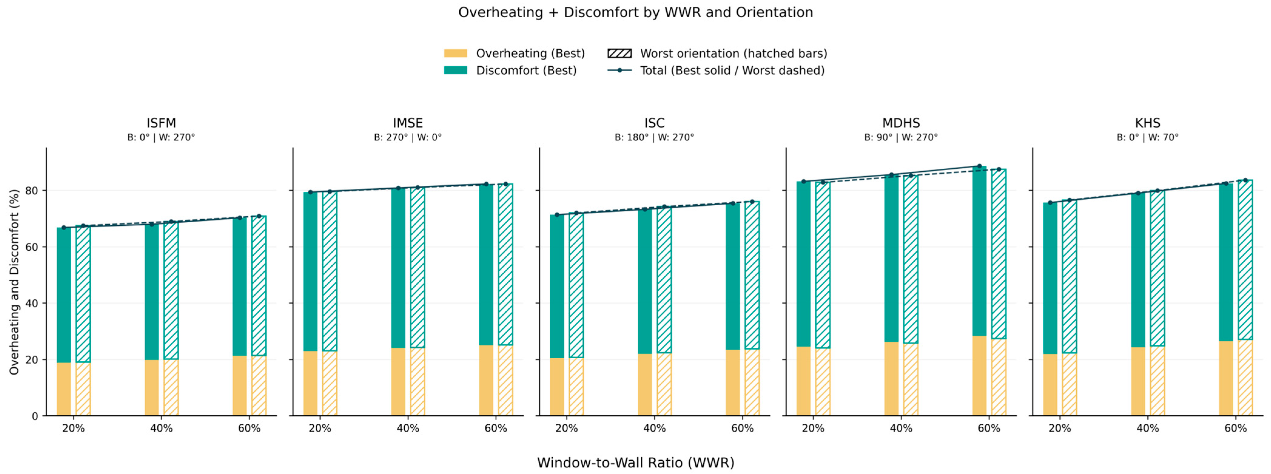 - Quantify the sensitivity of energy demand and thermal comfort to changes in the window-to-wall ratio (20%, 40%, and 60%) under controlled orientation scenarios.