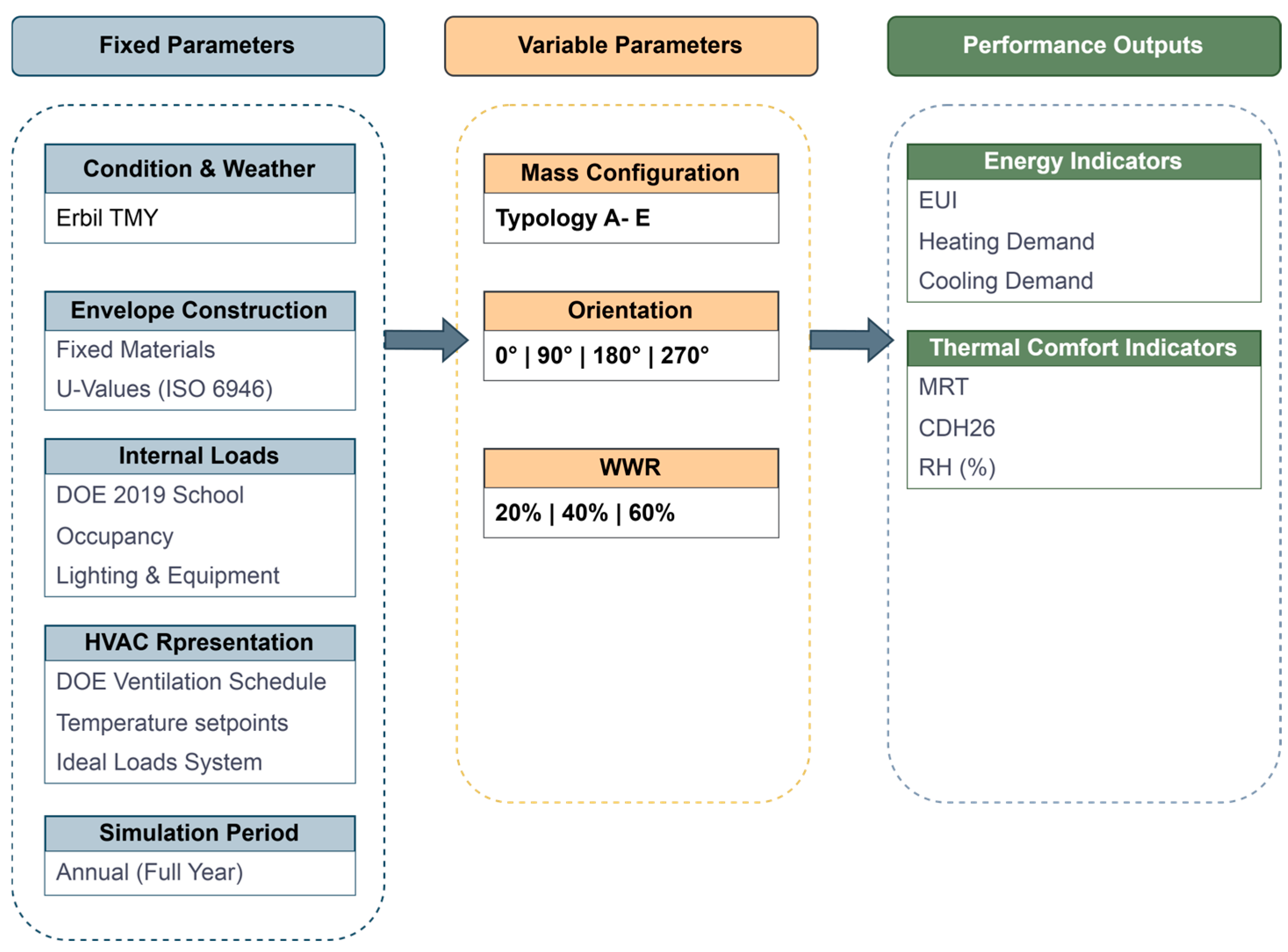 | Climate data | Erbil typical meteorological year (TMY) | Applied uniformly to all cases |