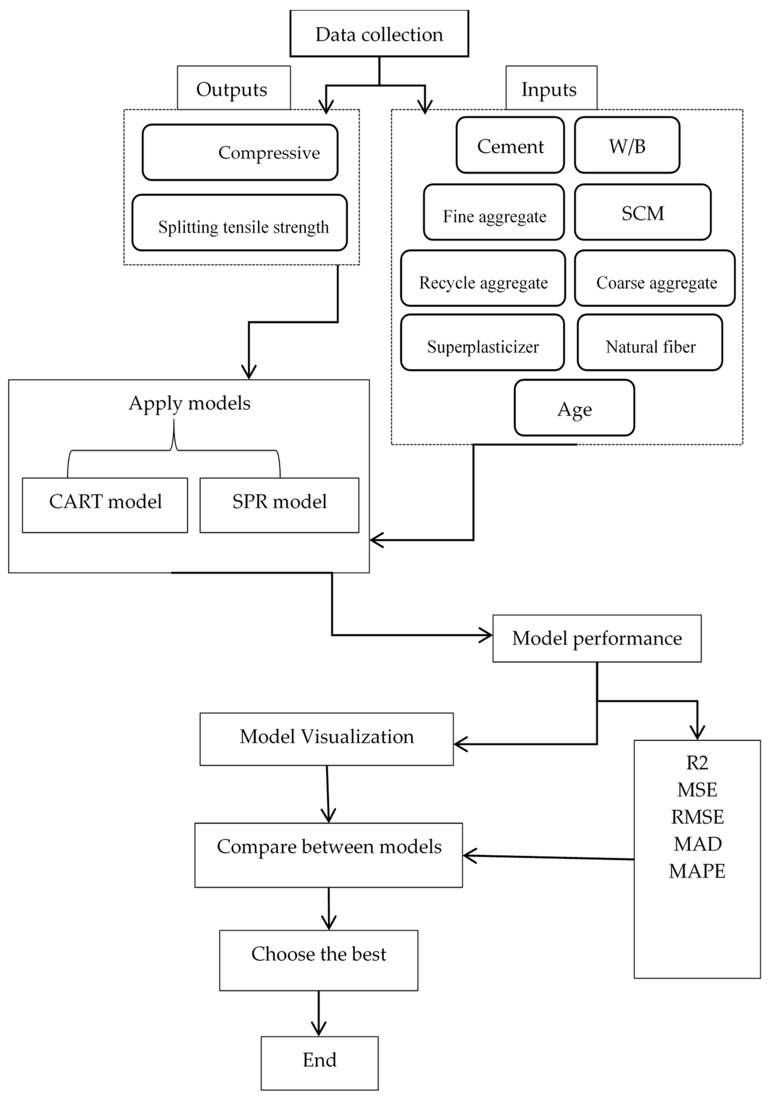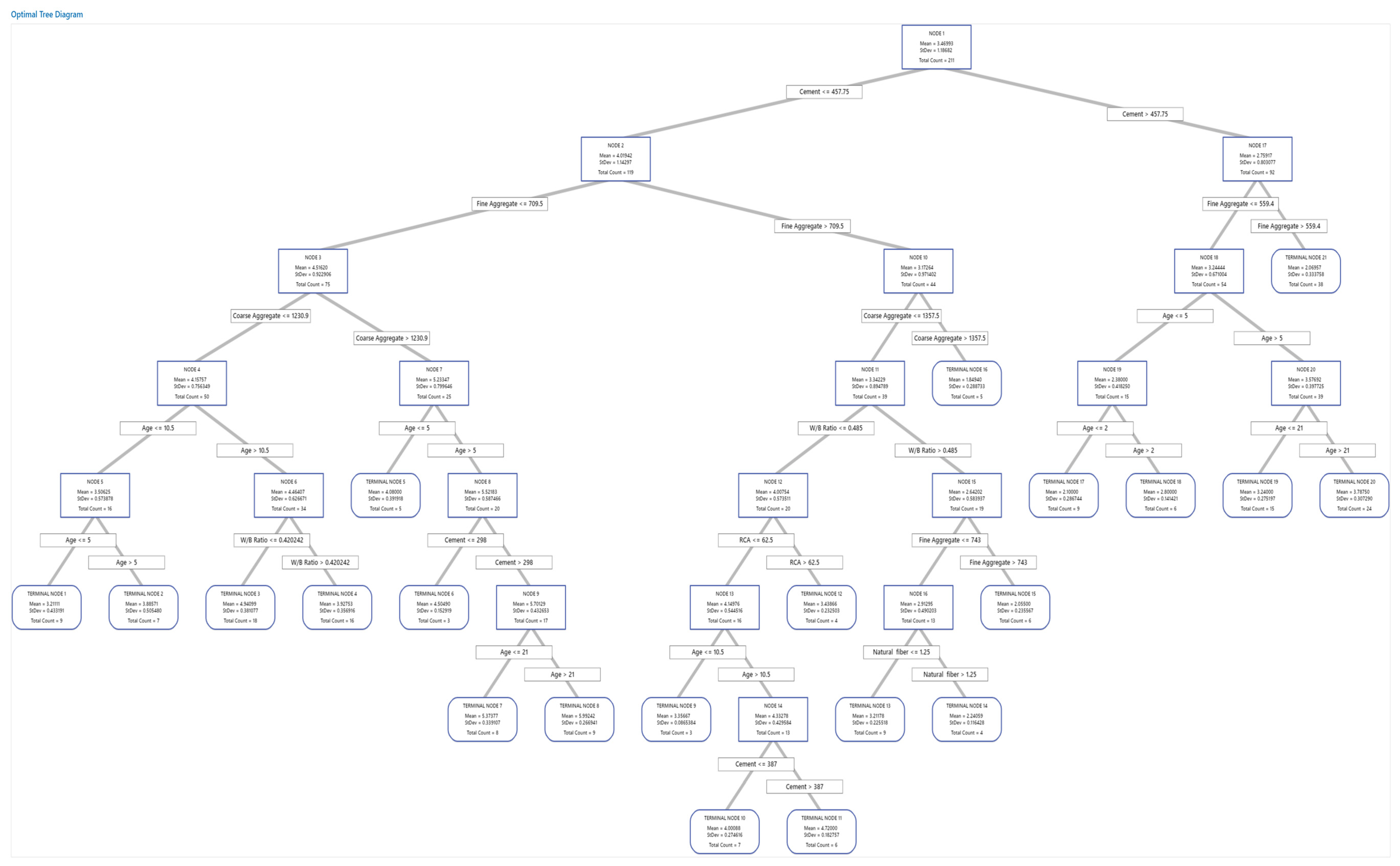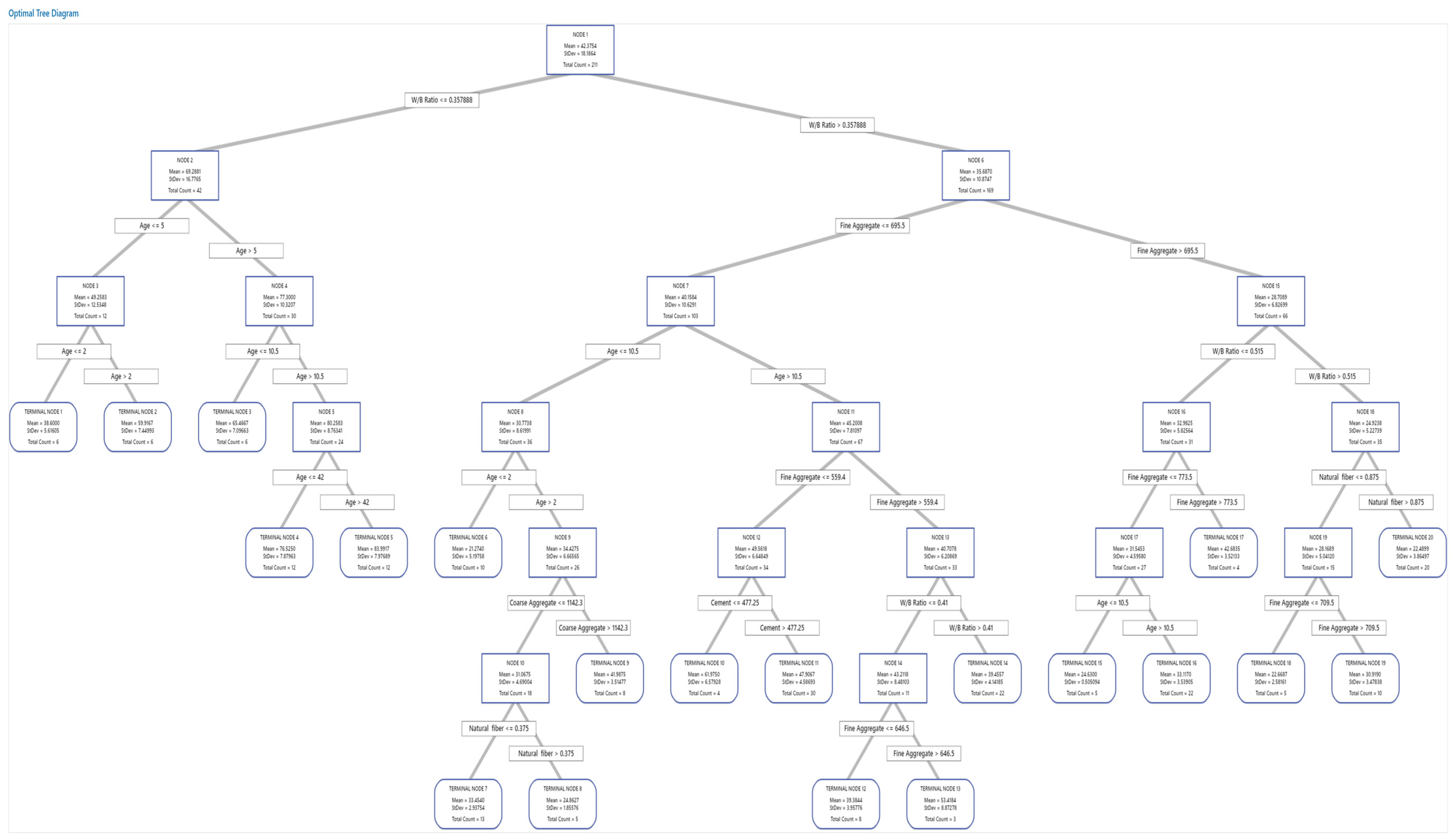 - Handle Nonlinearity and Multicollinearity: Unlike SPR, which relies on predefined polynomial terms (Equations (7) and (8)), CART intrinsically captures nonlinear interactions (threshold effects like *W/B ≤ 0.43* for compressive strength) without inflating variable significance, attributable to multicollinearity.