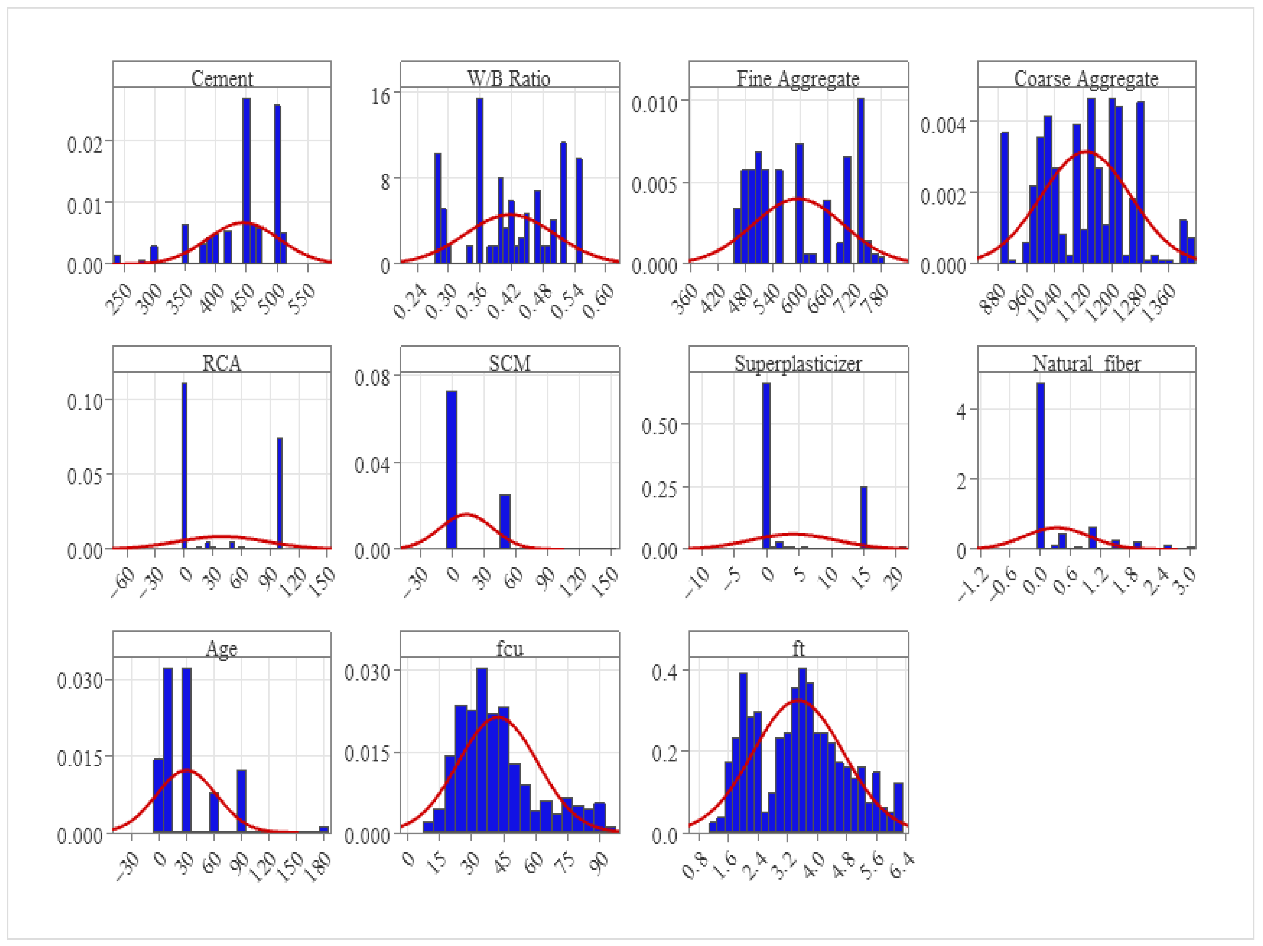 | Coarse Aggregate | CA | 1126.48 | 11.19 | 898 | 1420 | 0.09 | −0.56 |