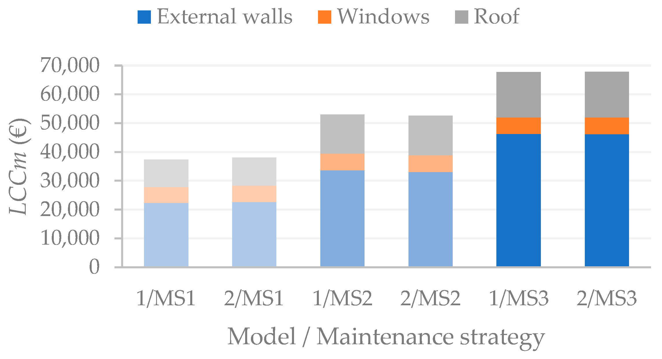 LCCm difference between both models is more accentuated in the case of MS1, probably due to shorter TR cycles, which imply more maintenance actions over the whole-time span, comparatively with MS2 and MS3. The cost of a TR is considerably higher than the expenses concerning CO or MI, especially for windows and roof, which, combined with its higher frequency, can be impactful on the