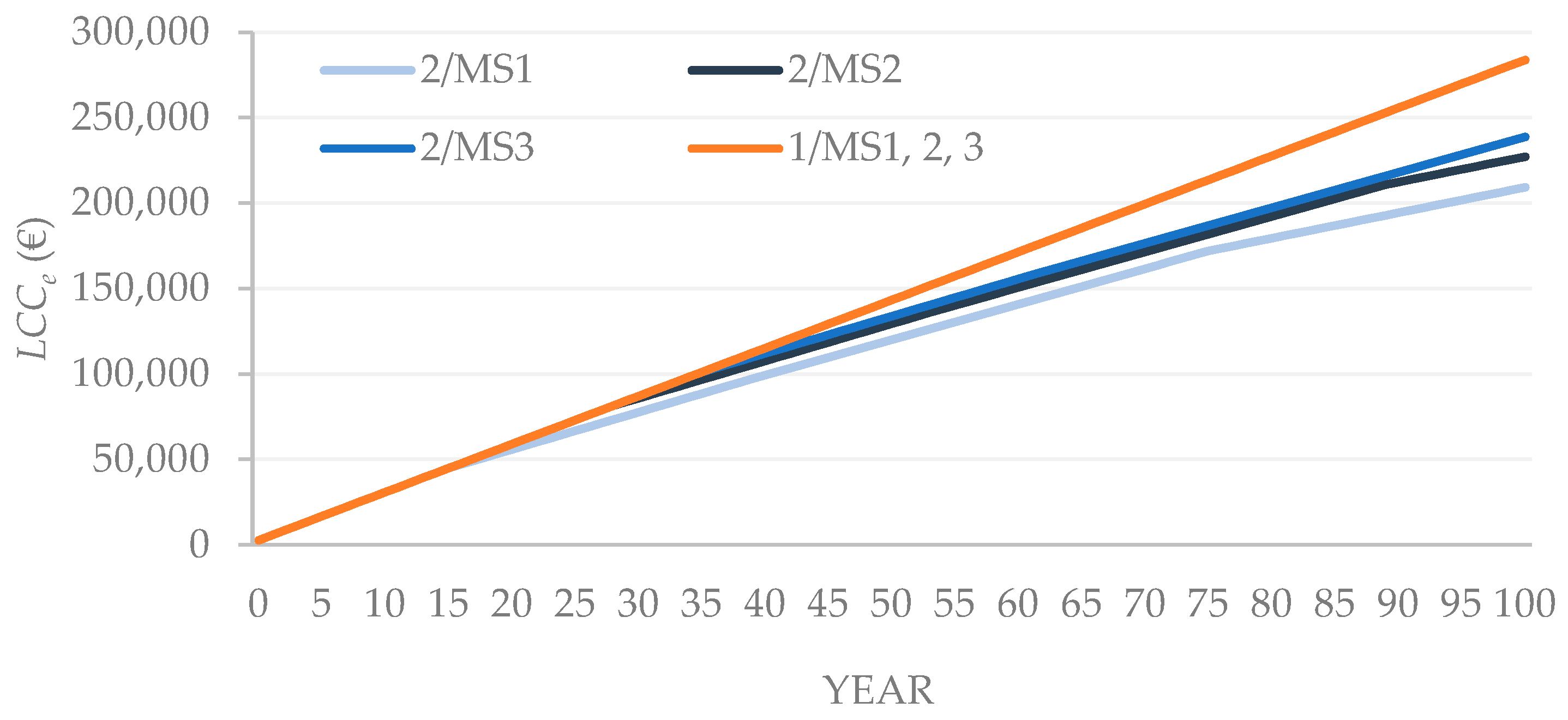 LCCm increases with the complexity of the maintenance strategy, which is progressively higher from MS1 to MS3, considering the number of planned actions (