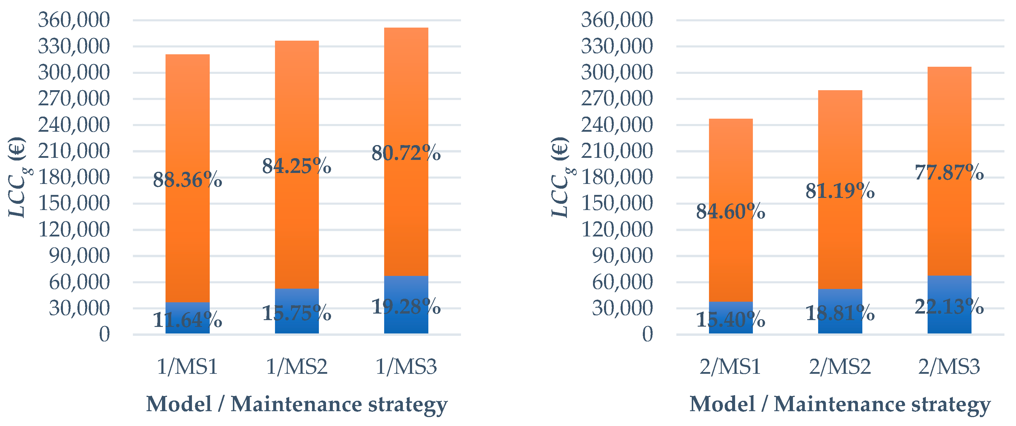 LCCg of Models 1 and 2, respectively, depending on the maintenance strategy (