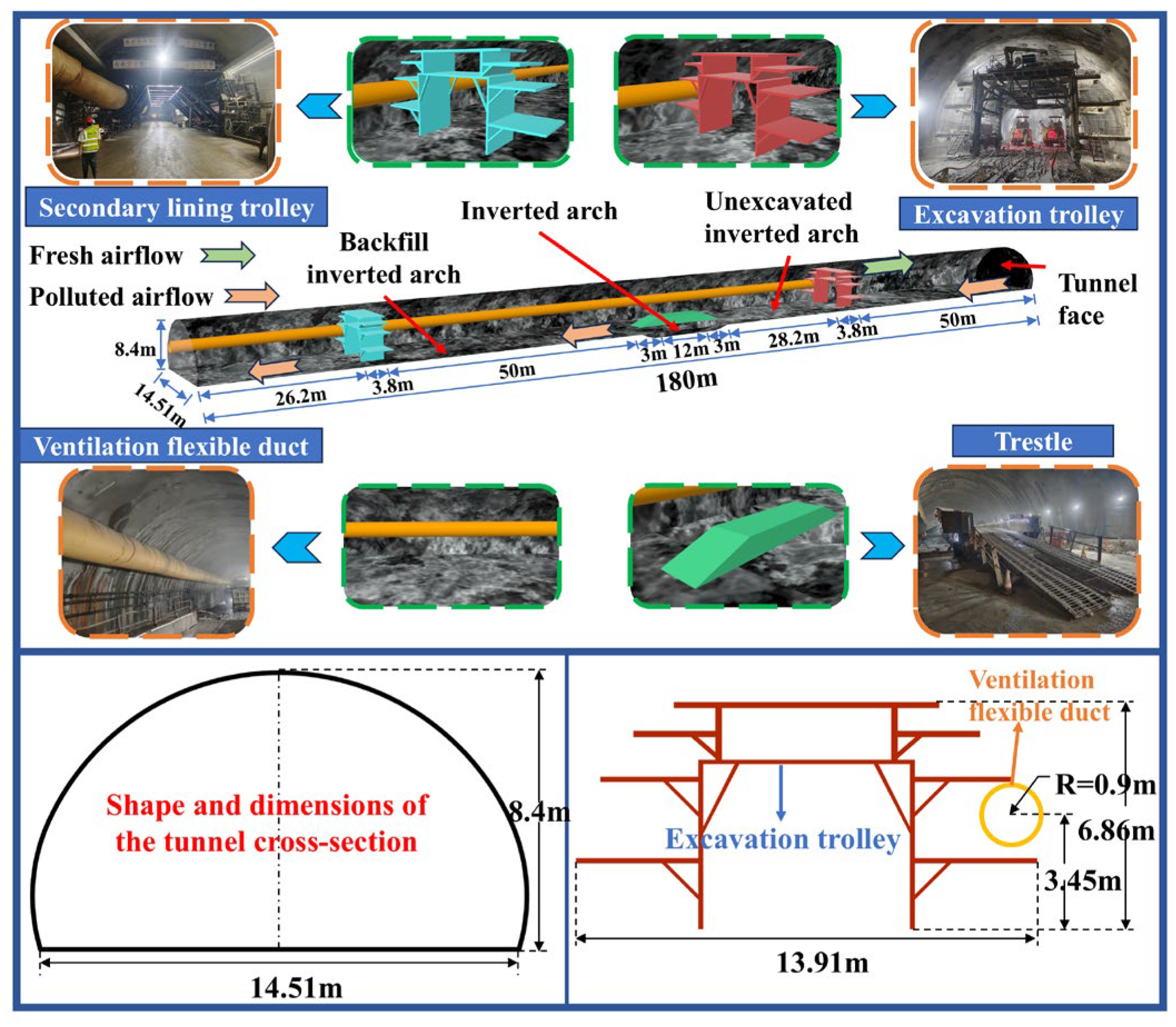 - Jiang, Z.A.; Wang, Y.P.; Men, L.G. Ventilation control of tunnel drilling dust based on numerical simulation. J. Cent. South Univ. 2021, 28, 1342–1356. [Google Scholar] [CrossRef]