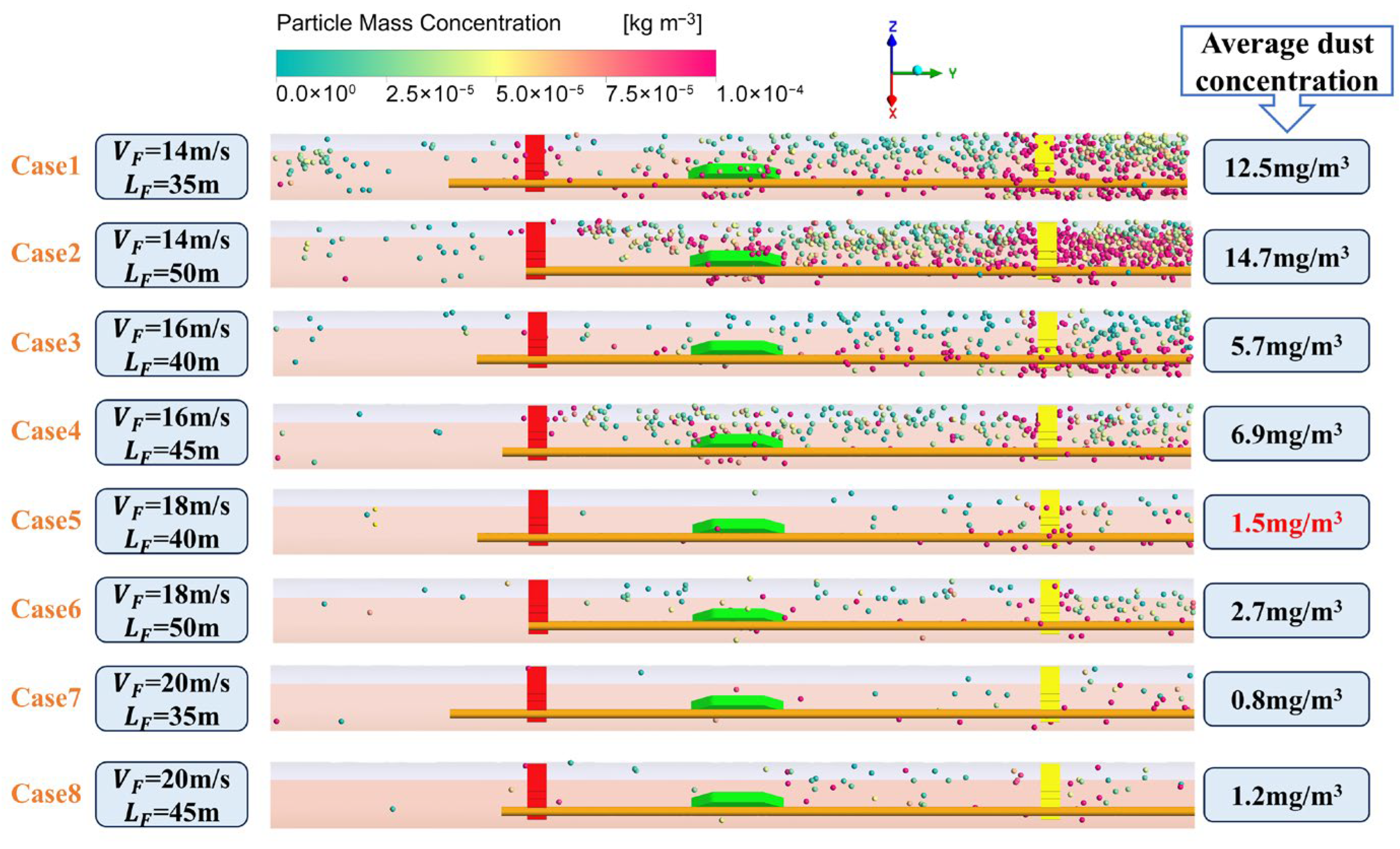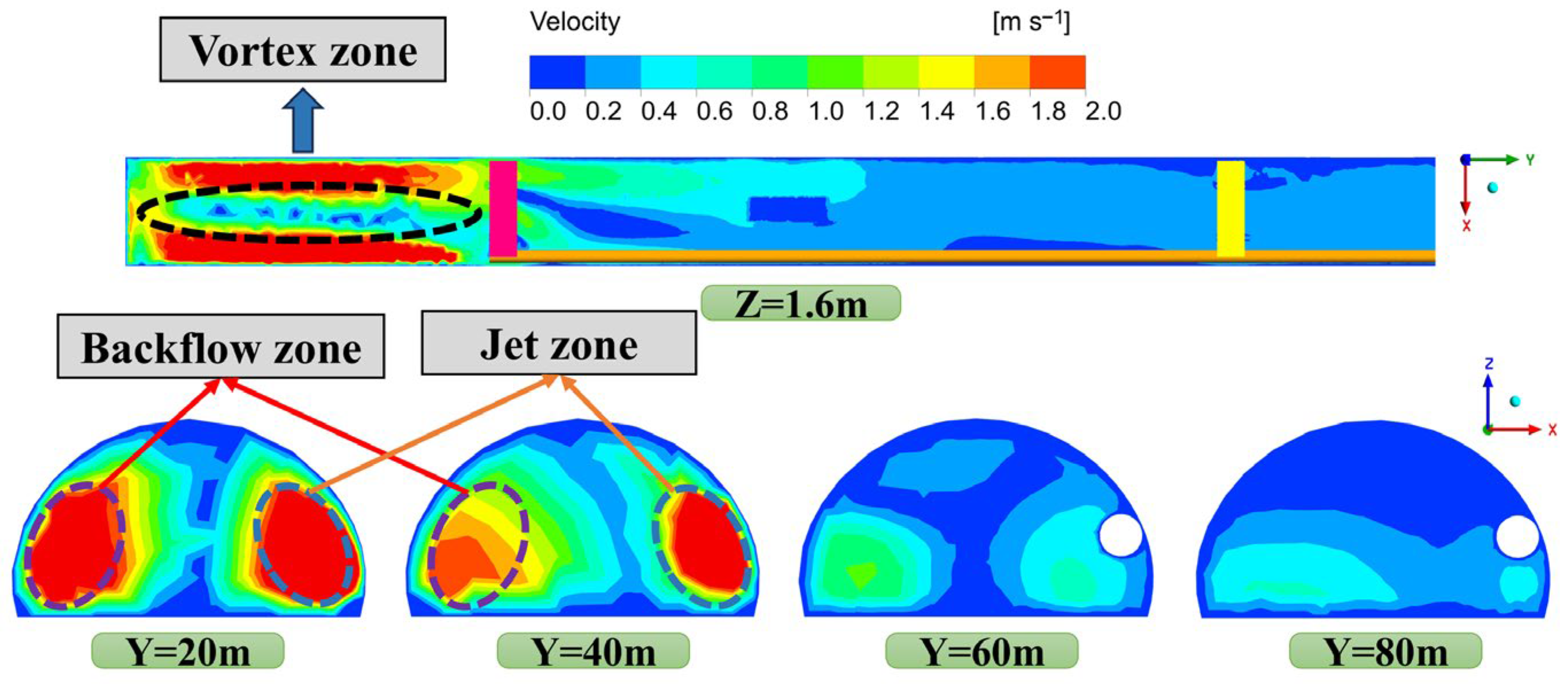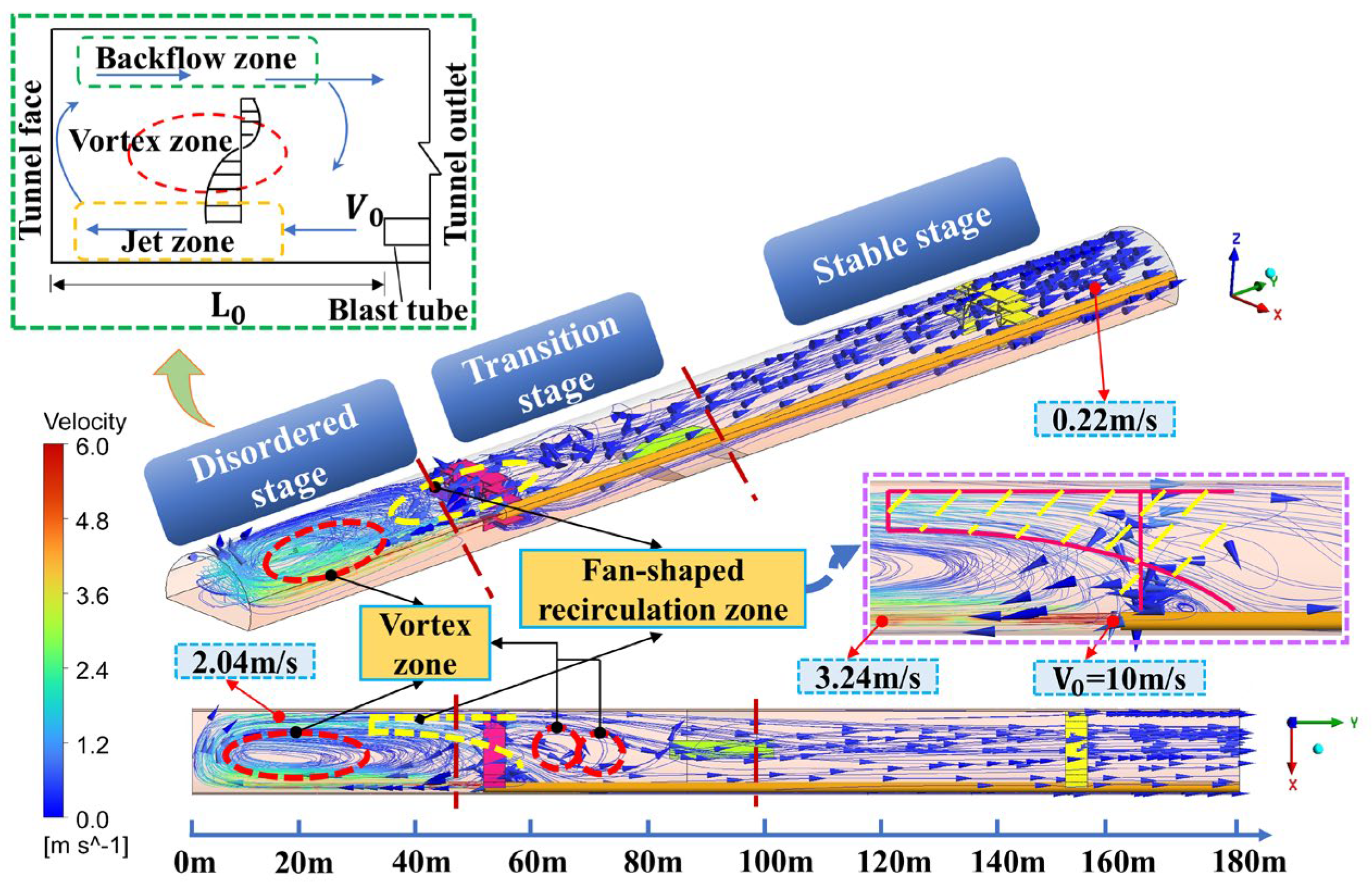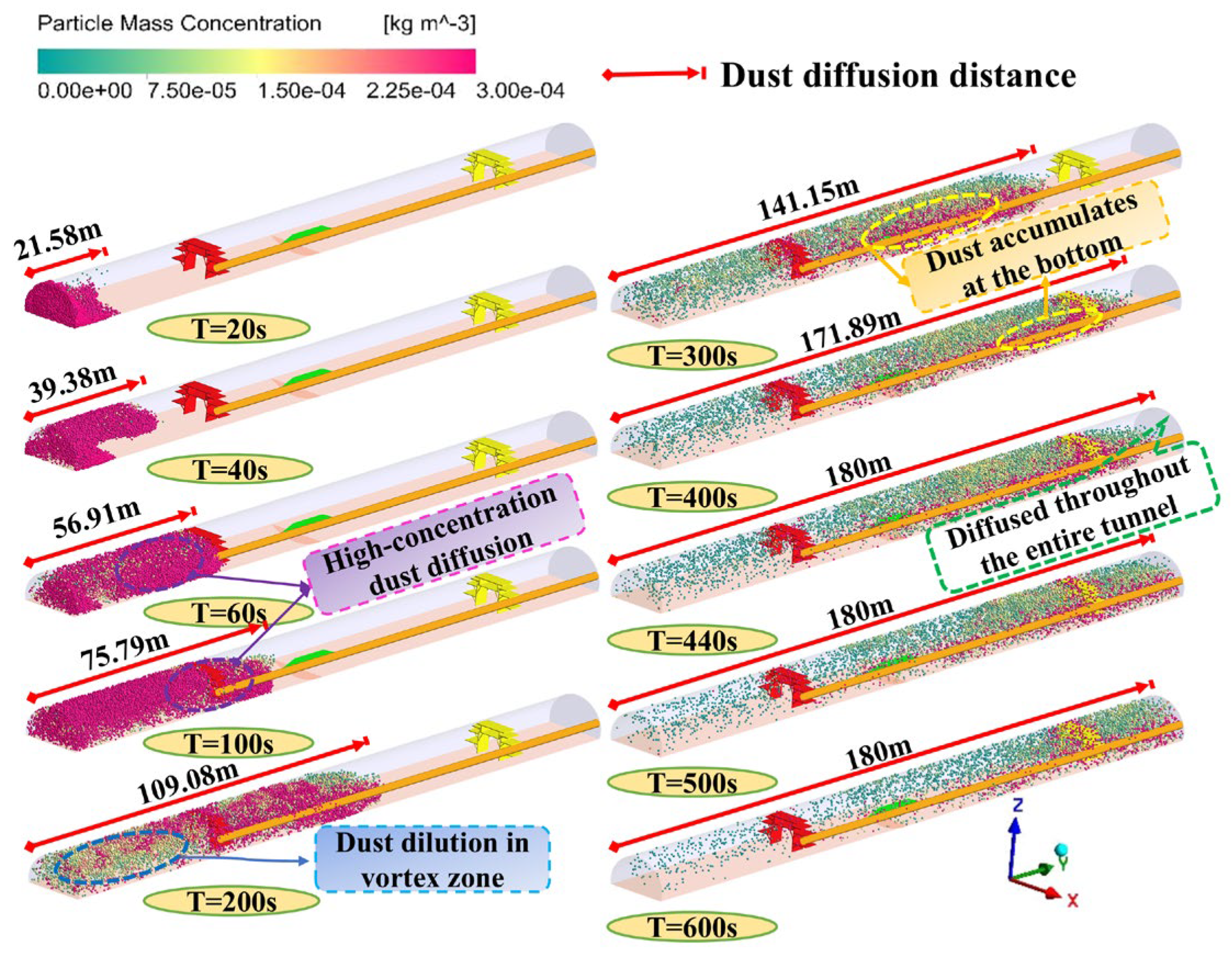 - The airflow field can be categorized into three distinct zones: the disordered zone, transition zone, and stable zone. The core air velocity within the vortex zone remains comparatively low. As a result of entrainment, a portion of the recirculated flow is drawn into the high-speed jet, forming vortex structures, while the remaining recirculated flow propagates toward the tunnel rear in a fan-shaped pattern. Because of the tunnel’s substantial cross-sectional area, the mean air velocity remains low, dropping to roughly 0.2 m/s before stabilizing. The transport of dust within the tunnel is primarily governed by advective airflow.