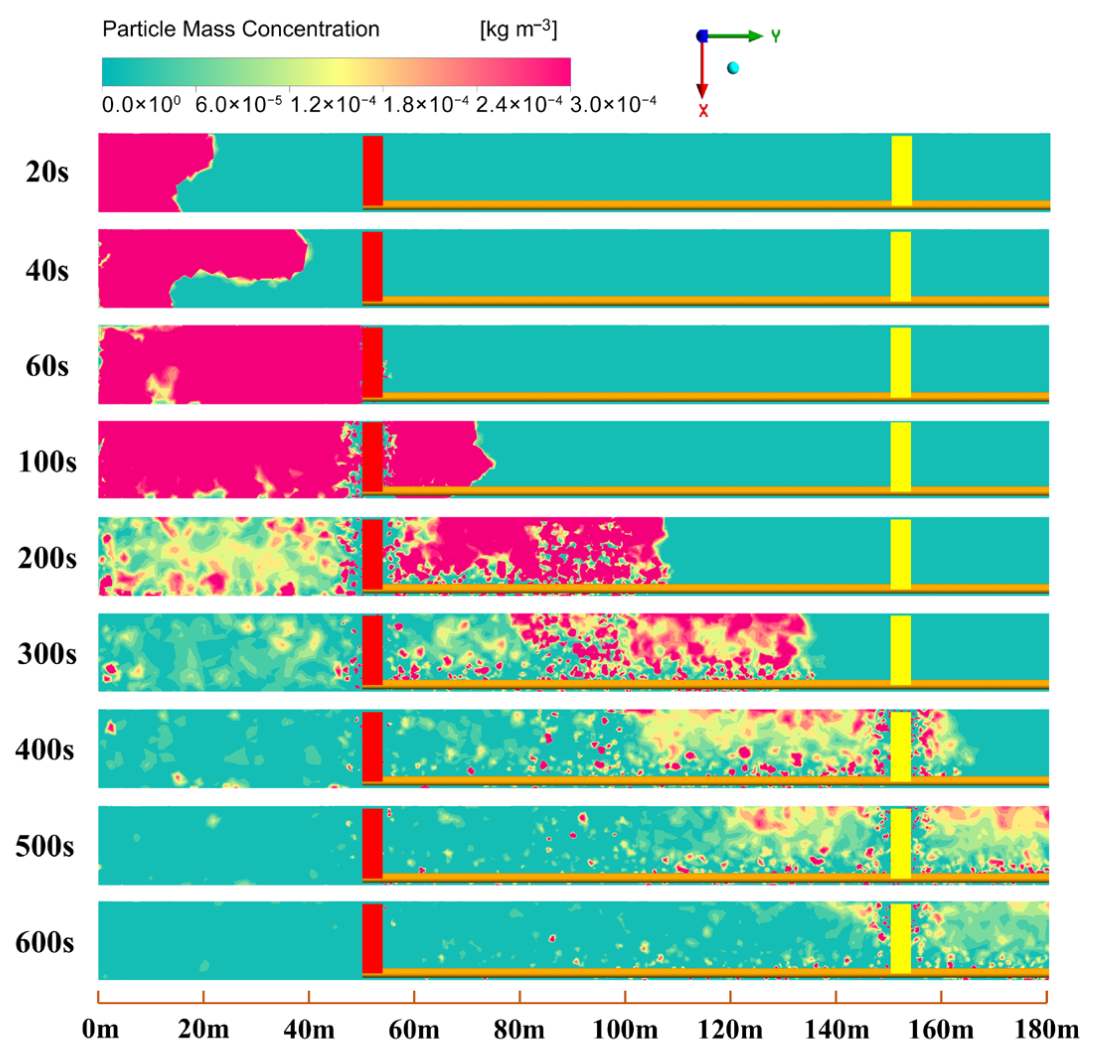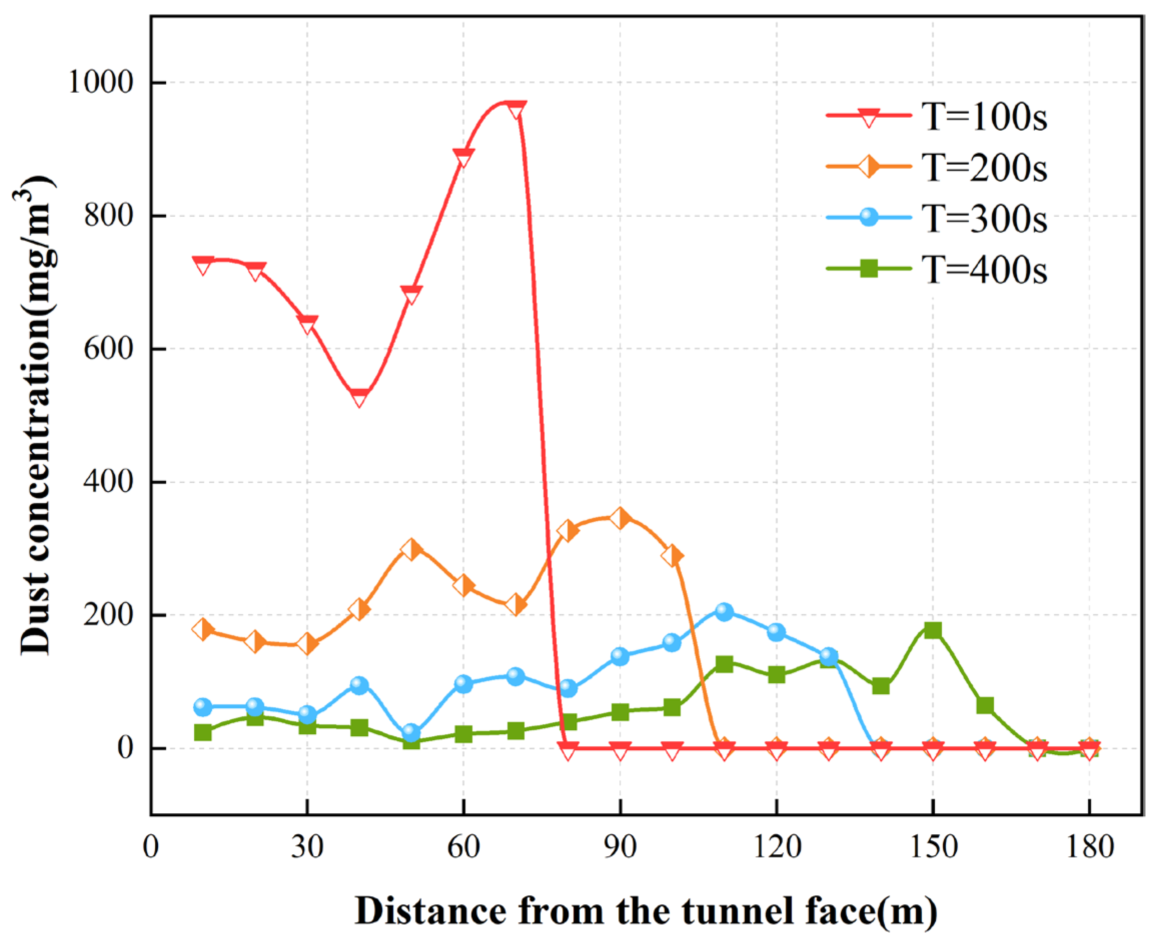 - At t = 100 s, the dust has propagated as far as 75.79 m from the source. By t = 400 s, the average dust concentration close to the tunnel face drops from 445.13 mg/m3 to 49.50 mg/m3, while dense dust clouds remain present near the excavation trolley and air duct. At t = 440 s, the dust reaches the tunnel exit, and its further diffusion is hindered by the secondary lining trolley. At t = 600 s, the average dust concentration in the 1.6 m breathing zone is 36.8 mg/m3, which exceeds the safety limit of 2 mg/m3 stipulated in the Technical Specification for Construction of Highway Tunnels [29].
