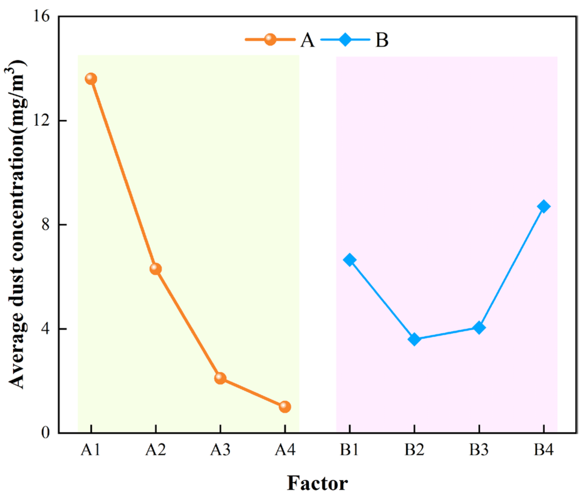 - When the outlet air velocity (Factor A) rises from 14 m/s to 20 m/s, the average dust concentration in the tunnel exhibits a declining tendency. At 20 m/s, the dust removal efficiency is optimal. However, the marginal benefit of further increasing the air velocity diminishes, leading to a gradual decline in the incremental effectiveness of dust removal.