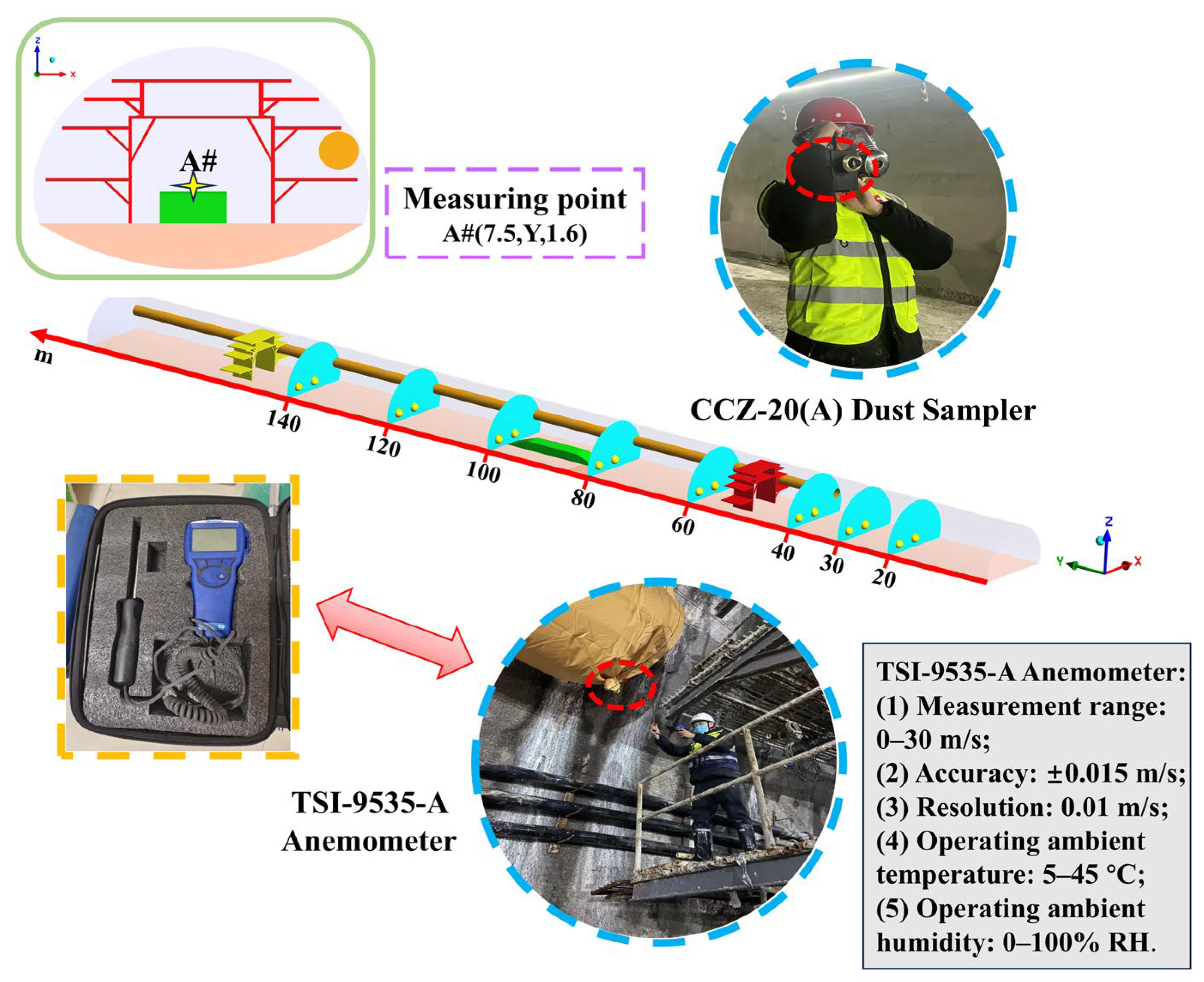 - Liu, N.; Wu, X.; Deng, E.; Ni, Y.Q.; Yang, W.C.; Li, G.Z. Dust diffusion laws during partition excavation by boom-type roadheader in a metro tunnel. Tunn. Undergr. Space Technol. 2023, 141, 105382. [Google Scholar] [CrossRef]