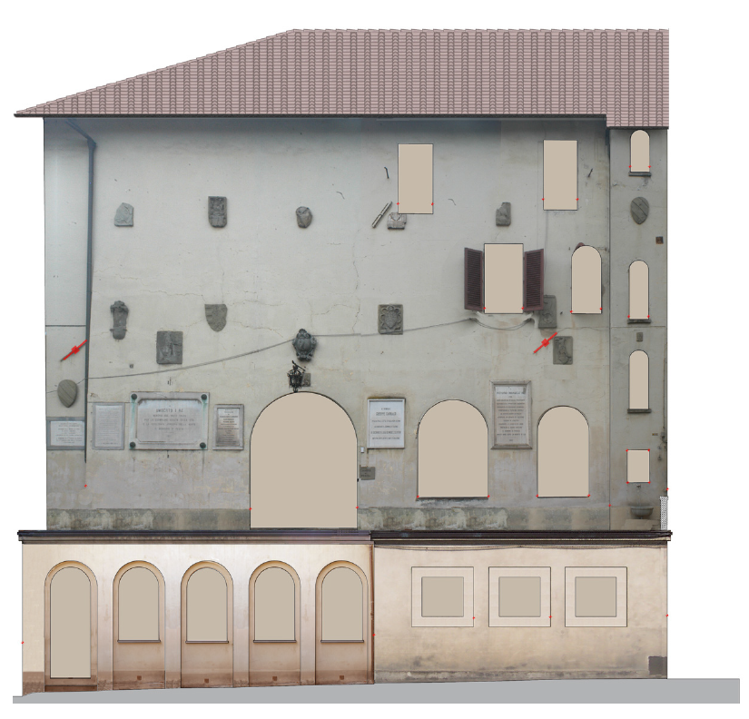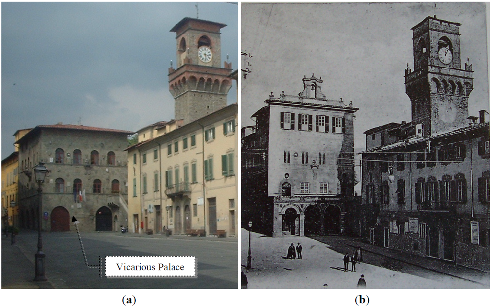 The Vicarious Palace is located in the main square (Piazza Mazzini) of the city of Pescia. Figure 1a shows the front view of the building. The research started with the analysis of historic data. The material was found in the archive of the Ministry Institution for Environmental and Architectural Heritage of Florence, Prato and Pistoia (the institution employed to preserve the cultural heritage in the Florence metropolitan area).