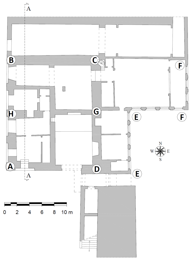 Figure 2. Plan layout of the ground floor (ABCD is the original medieval square nucleus; EE-FF is a twentieth century addition).