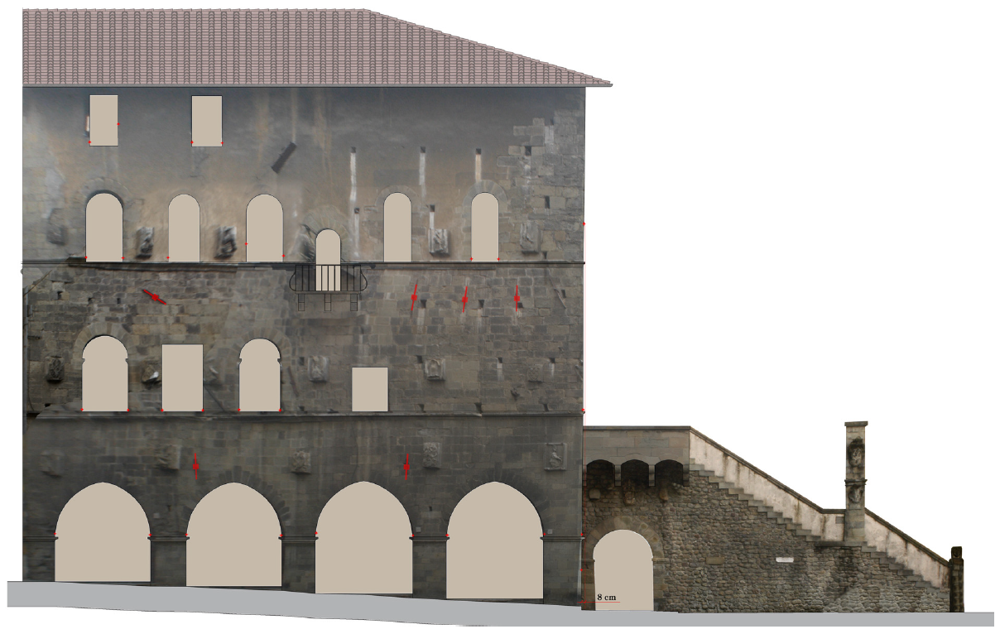 - Orlando, M.; Bartoli, G.; Betti, M. Evaluation study on structural fault of a Renaissance Italian Palace. Eng. Struct. 2010, 32, 1801–1813. [Google Scholar] [CrossRef]