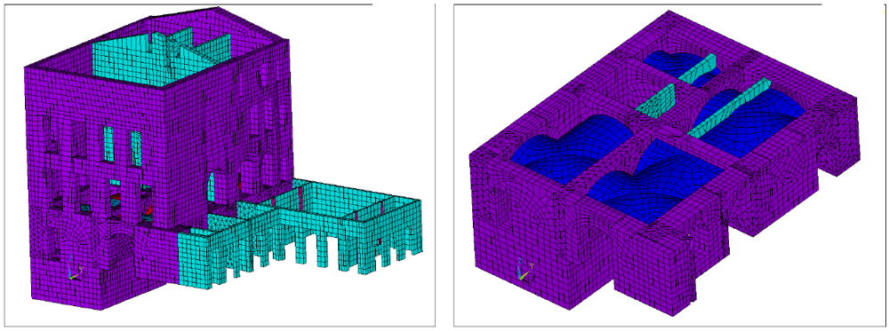 An in-situ survey of the building was made to accurately reproduce the geometry, the structural details and the irregularities of the Palace. This investigation consisted of a geometrical relief aimed at characterizing the masonry texture and to check up the quality of wall-to-wall, wall-to-floors and wall-to-roof connections. The 3D model is represented in Figure 7. It consists of 37,402 nodes, 36,557 Solid65 elements and 813 Shell63 elements, corresponding to 108,399 DOFs.