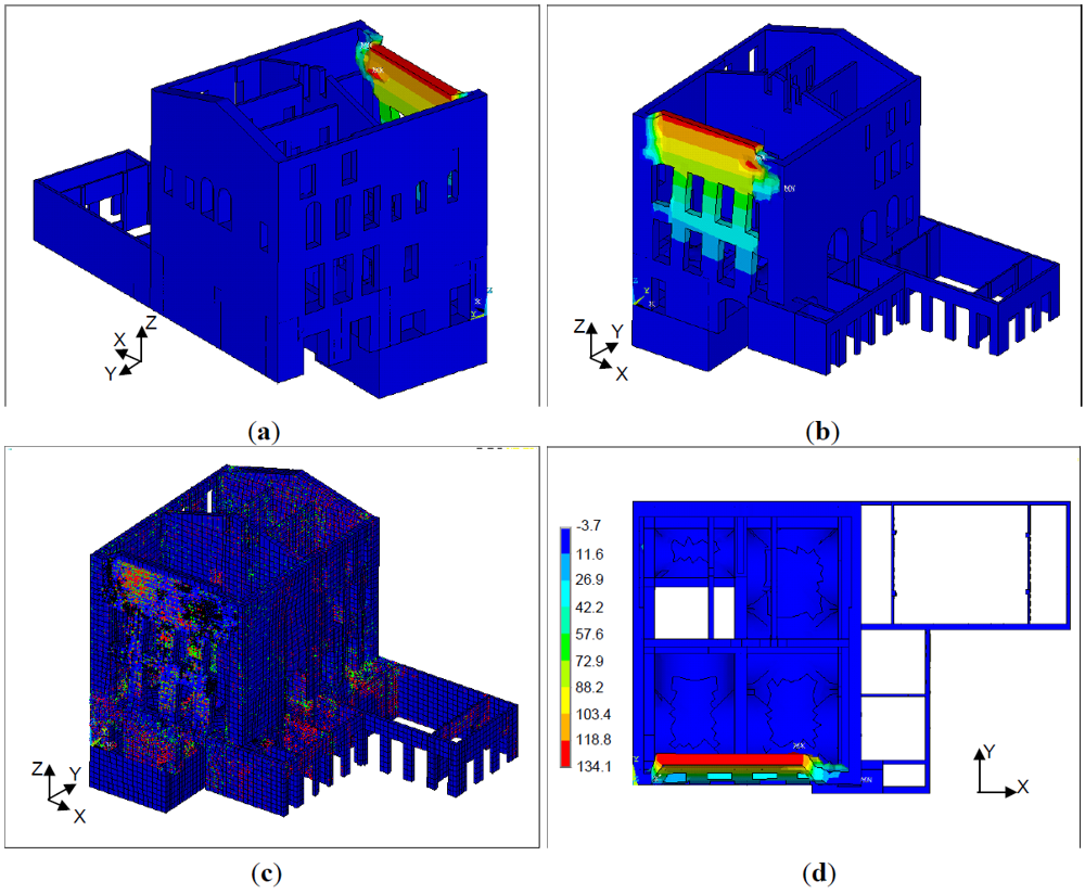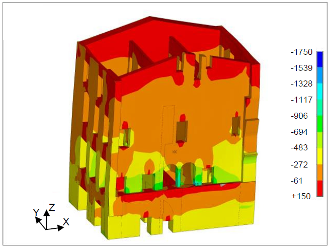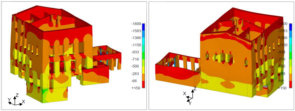 Firstly, the 3D model was used to evaluate the stresses in the masonry walls produced by the vertical loads i.e.,: the dead weights, the live floor loads (2.0 kN/m2) and the snow load on the roof (1.1 kN/m2). The whole structure was analyzed in the nonlinear range to identify the weak points of possible failure, assuming fixed base restraint conditions.
