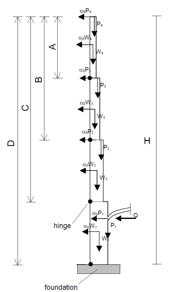 Out-of-plane mechanisms; Pi are the vault or the floor vertical loads; Wi are the own weights of the walls; α 0Pi and α 0Wi are the seismic loads.