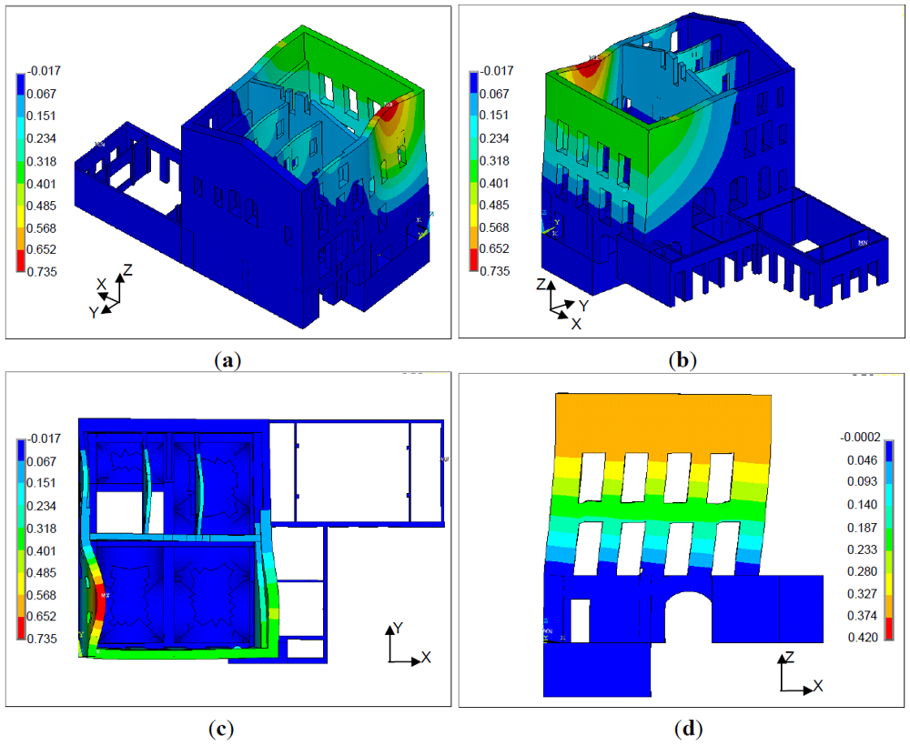 Figure 11. Pushover analysis results (+X direction): (a), (b), (c) and (d) horizontal displacement in X direction (units are m).
