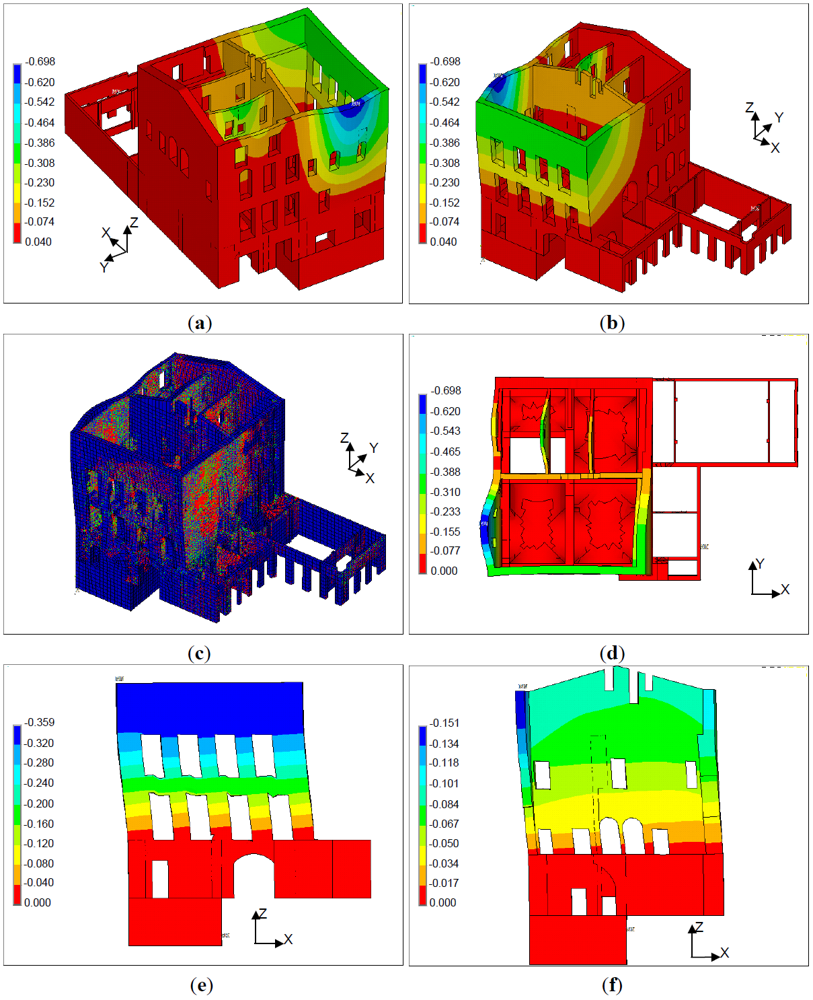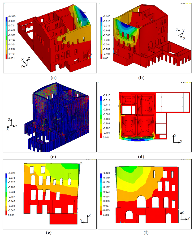 Firstly, a structural analysis of the Palace was made using a finite element model. Specific assumptions of the material properties and the nonlinear behavior of the masonry were considered. Static analysis under vertical loads (dead and live loads), and pushover analyses were performed, according to the Italian Technical Recommendations [3,4]. Next, a simplified approach based on the kinematic theorem of limit analysis was applied. With reference to the failure mechanisms activated in similar buildings during past earthquakes [18,19], some macro-elements were individuated and analyzed.
