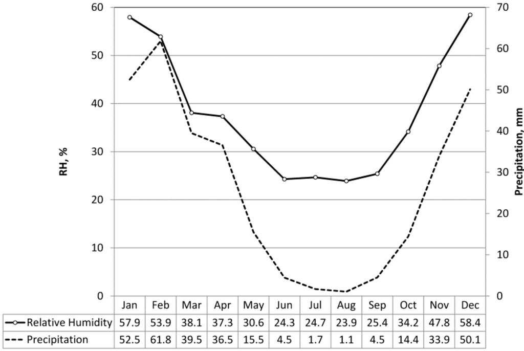 Five year average of mean monthly relative humidity and rainfall for Tehran (Geophysics station, 2005–2009).
