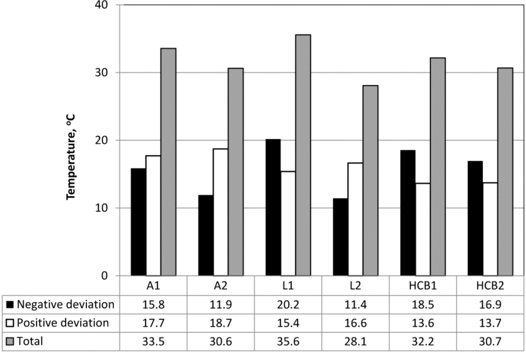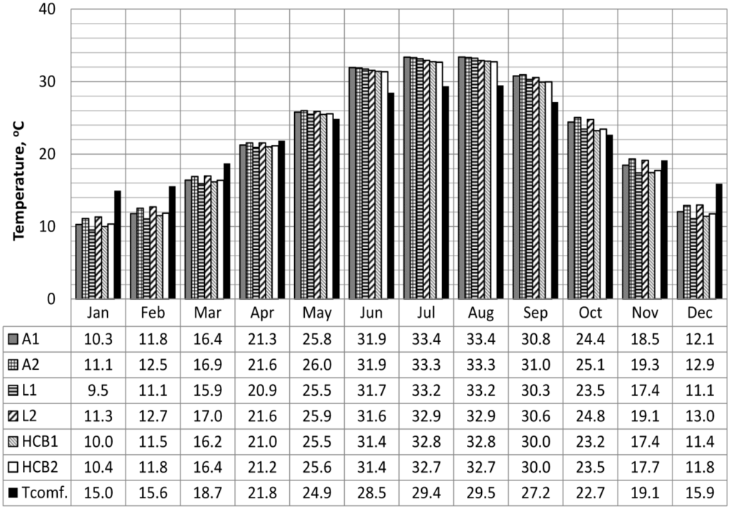 The summer-time performance, as indicated by the positive deviation in Figure 8, indicates that HCB1, HCB2, and L1 perform better than the other three wall types but that A1, A2 and L2 have better performance in winter. However, the sum for wall types L2, A2 and HCB2 reveals the lowest total deviation of Tin from Tcomf., which supports the application of insulation in such walls. The application of wall type L2 in place of L1, results in 7.5 °C decrease in deviation of Tin from Tcomf., leading to reduced energy demand for conditioning of the space. Heidari [] estimates that each degree reduction in heating/cooling loads results in 7% energy saving.