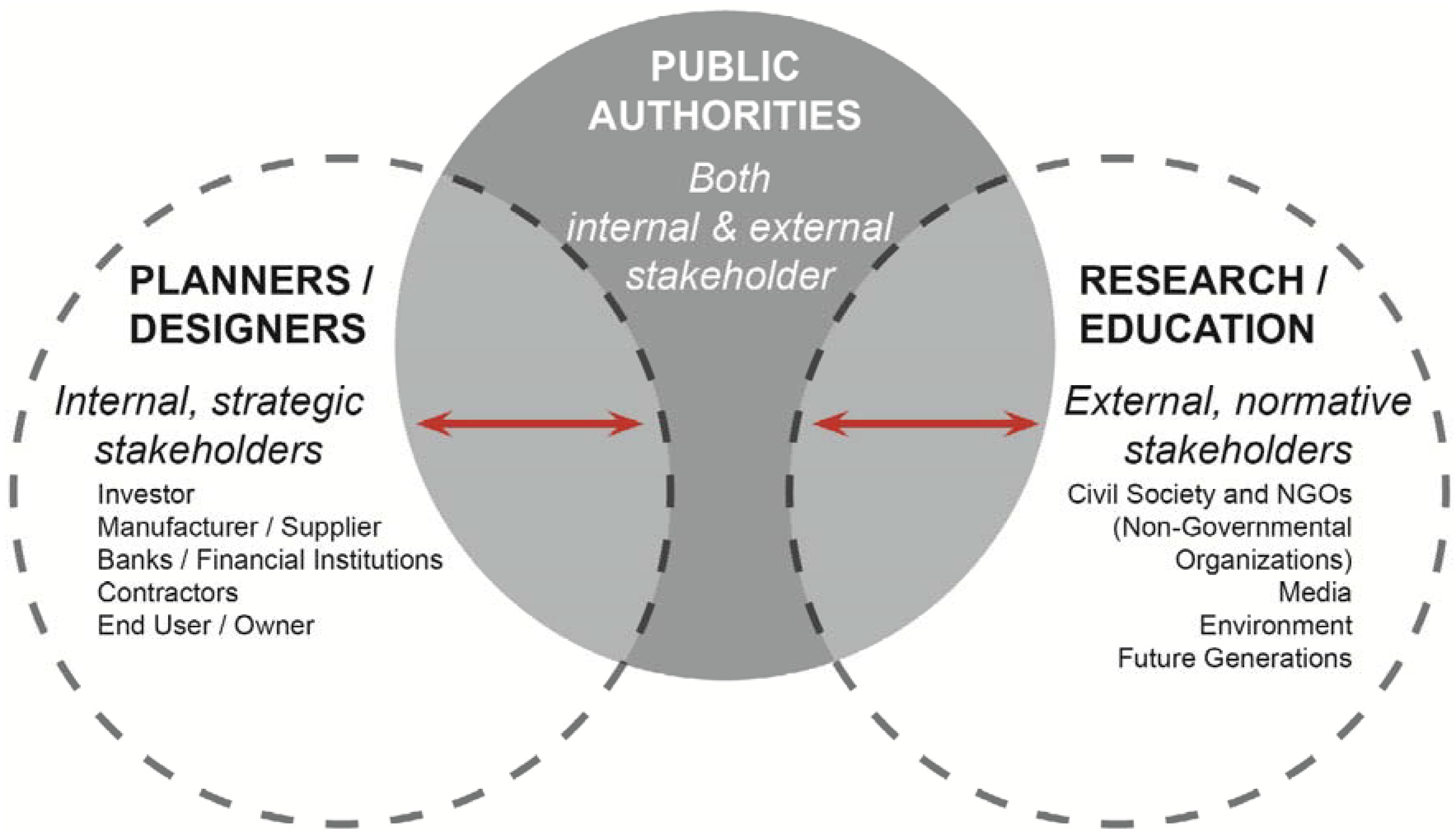 The concept of stakeholders and their management references the organization of groups/individuals around specific focal issues, where a smaller group represents much larger groups of individuals [35] and reflects a greater mix of actors [36,37]. Sustainable construction is a suitable example of such a focal point as it is not a topic that is relevant to single individuals and organizations, but is globally important. In addition, critically acknowledged across the literature is that no single group can effectively change common praxis [38]. Rather, harnessing the interest and input of actor networks who are not directly involved in decision making processes but are both impacted and have the potential to impact others is an important aspect of an issue oriented conception of stakeholders [39,40]. According to Feige et al. [38], research conducted in the Swiss context has shown that in sustainable construction efforts, key stakeholders fall into three main categories where “internal, strategic stakeholders” are concerned with different phases of the project’s life cycle, and “both internal and external stakeholders”, as well as “external, normative stakeholders” represent an interest in all phases of a project’s life cycle. In this view, “planners/designers” are indicated as functioning in a categorical role of “internal, strategic stakeholders”, along with investors, manufacturer/suppliers, banks/financial institutions and end users/owners. “Researchers/educators” are designated as “external, normative stakeholders” beside civil society and non-governmental organizations (NGOs), the media, environmental groups and the interests of future generations. Lastly, this schema recognizes a diverse range of actors involved and creates horizontal links across the categories through the “main concerns” of each grouping such as “regulation”, “knowledge”, “corporate social responsibility”, “economic feasibility”, and “personal beliefs” which bridge the categories. Also, a distinction is provided in regard to technology between the interests of “planners/designers” and “researchers/educators”, where the former group is focused on its “creative and efficient application”, second to “knowledge” and the latter group emphasizes “knowledge”, second to “technology” [41]. Experts who fell within the overlapping zones were targeted for interview (Figure 1).