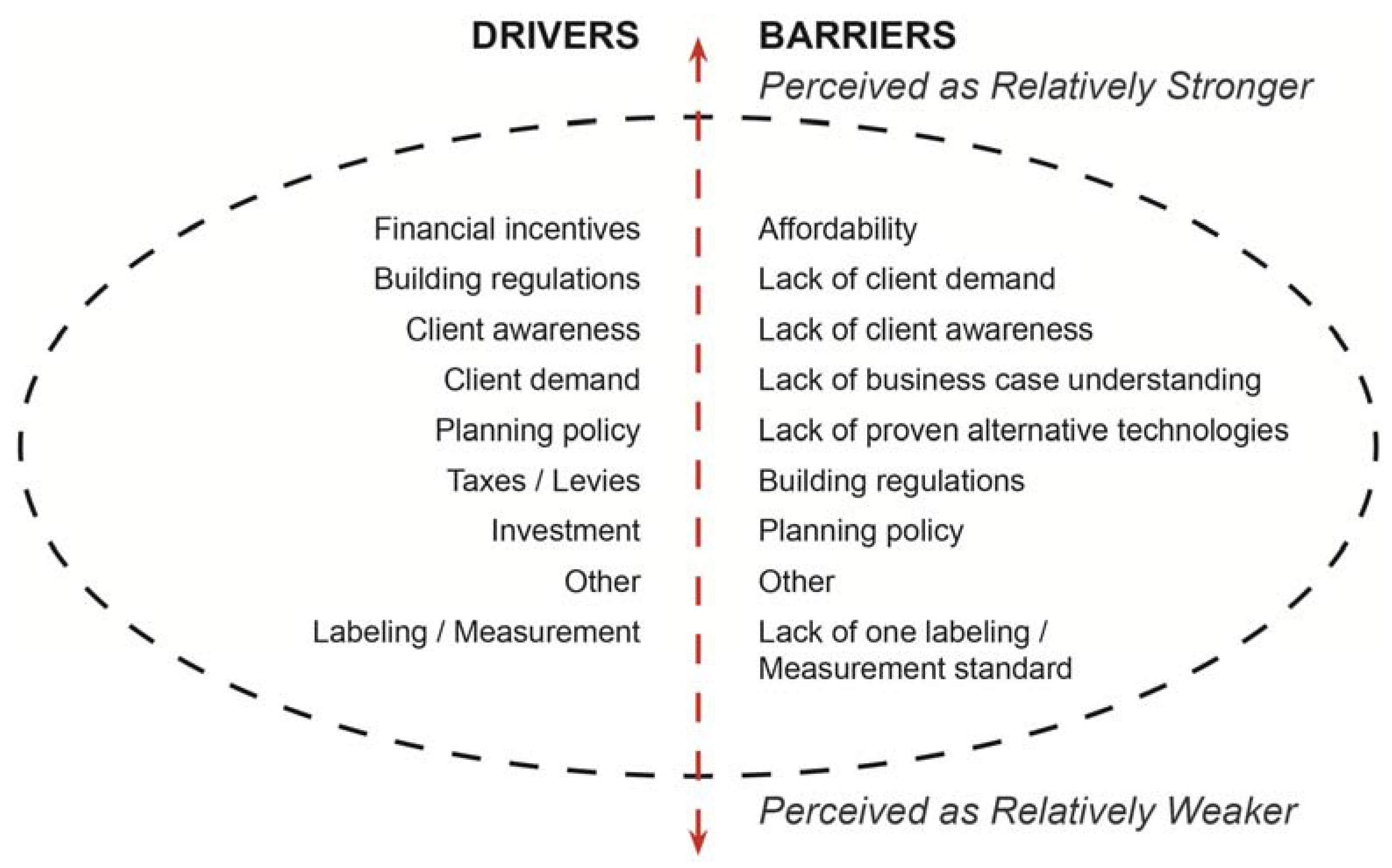Institutions can take the shape of legislation or organizations that can manifest in habits, traditions and social practices. In the literature both formal and informal institutions have been identified as functioning as barriers to sustainable construction. Typically, the development of rule making is considered a key source of friction within the regulation of issue driven concerns such as sustainable construction, and can be precipitated by a combination of agency fragmentation and informational asymmetries. Informational asymmetries refer to “gaps” in the decision-making processes between key actor groups such as the building and real estate sectors; construction and management; construction and use; in addition to urban-scale planning and building project development [49]. As previously noted in the introduction, the concepts of gaps and barriers like information asymmetries have been argued within STS scholarship as oversimplifications of more complex processes. However, since pervasively used in working practice, it was considered relevant as interviewers to become familiar with these topics in order to recognize them, and subsequently redirect interviewees to focus on issues linked to specific boundary objects, the interaction between them and their experiences with the aim of teasing out possible relationships relevant to the notion of sustainable construction as examples of standardized packages. Drawing from current literature and 83 questionnaires, Pitt et al. [50] rank widely reported drivers and barriers of sustainable construction, highlighting which social, institutional and material actors are seen as more or less challenging (Figure 4). Next, relevant details regarding institutional and material actors in the Swiss context are provided.