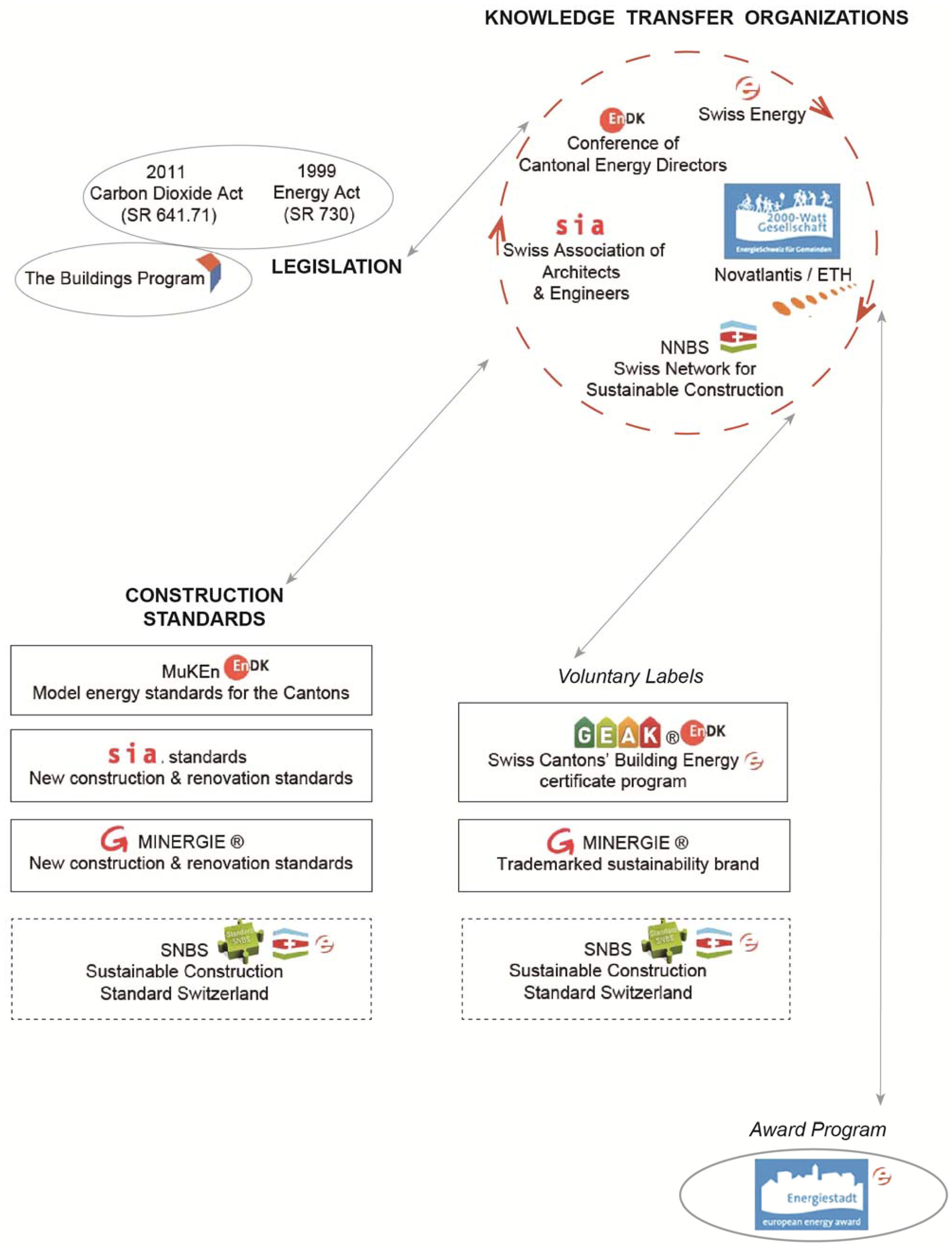 The radical shift in the Swiss building and design sectors was precipitated by the oil crisis in 1973, when the sharp increase in energy costs highlighted the poor quality of building construction and inefficient energy consumption linked in part to extremely low fuel costs [51]. Although territorial energy consumption, greenhouse gas intensity and emissions roughly match European consumption patterns per capita [52], the country heavily relies on imports for approximately 80 percent of its needed fossil fuels and other combustibles. Also, despite producing roughly 56 percent of its electricity domestically, additional imports are needed in the colder months due to greater demand [53]. Second only to the transport sector, the Swiss building sector has been identified as an important source of greenhouse gas (GHG), at 19.7 Mt of CO2e [54], which includes indirect emissions from the consumption of electricity. Direct emissions accounted for 17.6 Mt of CO2e in 2005 or 89 percent of building emissions. Hence, the building sector has become an area of intense focus, as it provides opportunities to further significantly reduce GHG emissions through primarily retrofits (6.1 Mt of CO2e), but also by shifting to alternative heating systems (4.2 Mt of CO2e), more efficient new construction (0.7 Mt of CO2e), and LED lighting (0.3 Mt of CO2e) [55]. Current energy policy outlined in the Swiss federal constitution that impacts the building stock identifies strategic sectors where energy reduction measures must be addressed. However, the respective cantons retain significantly more power in determining their implementation. This constitutional edict is supported by more detailed legislation in the form of the Energy Act and the Carbon Dioxide Act [56,57,58]. Figure 5 highlights the relationships between energy and emissions focused boundary objects: federal legislation, construction standards, knowledge transfer organizations and an award program.