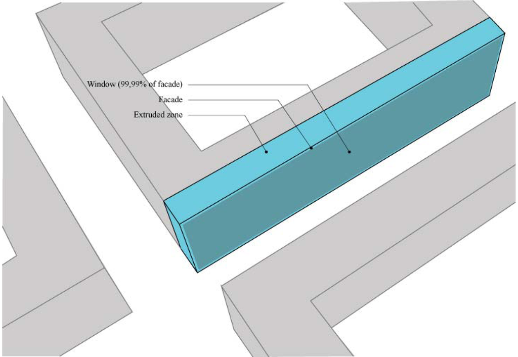 It was expected that the best comparison between the two technologies (PV or ST) was by comparing the hourly output. In order to calculate the hourly output of the solar energy systems, it was necessary to simulate the diffuse and direct irradiation on the façade. Most parts of the façade are shaded by surrounding buildings which makes it complicated to compute the direct and diffuse solar irradiation manually. Therefore, an EnergyPlus simulation was run to simulate the hourly diffuse and direct solar irradiation on the façade, a tool which is used in earlier studies [24,25,26]. For EnergyPlus to run, the analysed façade is extruded 1 m backwards, constructing a zone (Figure 2). A window is inserted in the analysed façade, with a size of 99.99% of the façade. This window was given the material window low-iron 2.5 mm (with a solar transmittance at normal incidence of 0.904). The values for the direct and diffuse solar gain through the windows were then later corrected with a factor of 1/0.904. This will cause a small source of error since the solar angle is normally not at normal incidence. However, the construction of a fictitious zone in EnergyPlus was necessary to include the full effect of shading due to surrounding buildings.