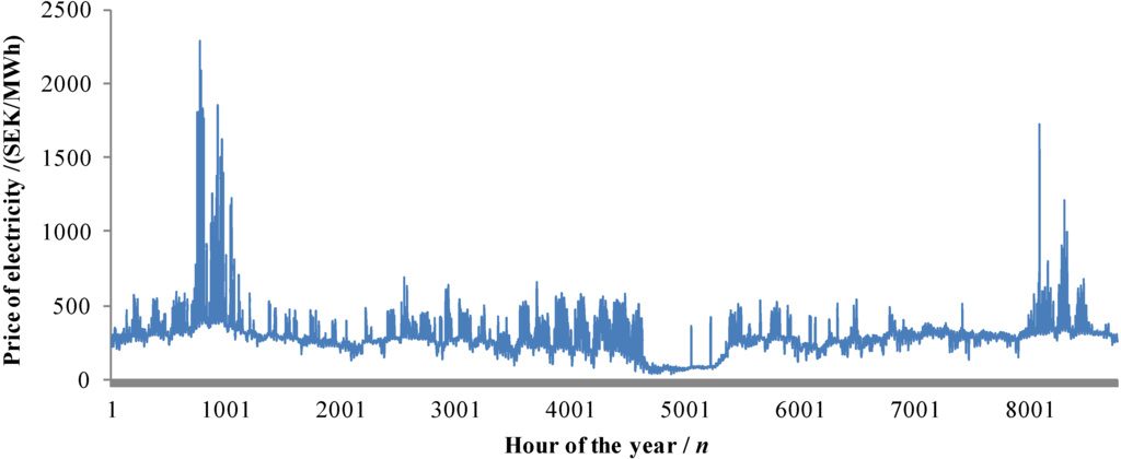 Hourly market electricity price from NordPoolSpot (in 2012, region SE4) [29]. Reproduced with permission from [29]. Copyright 2013 NordPoolSpot.