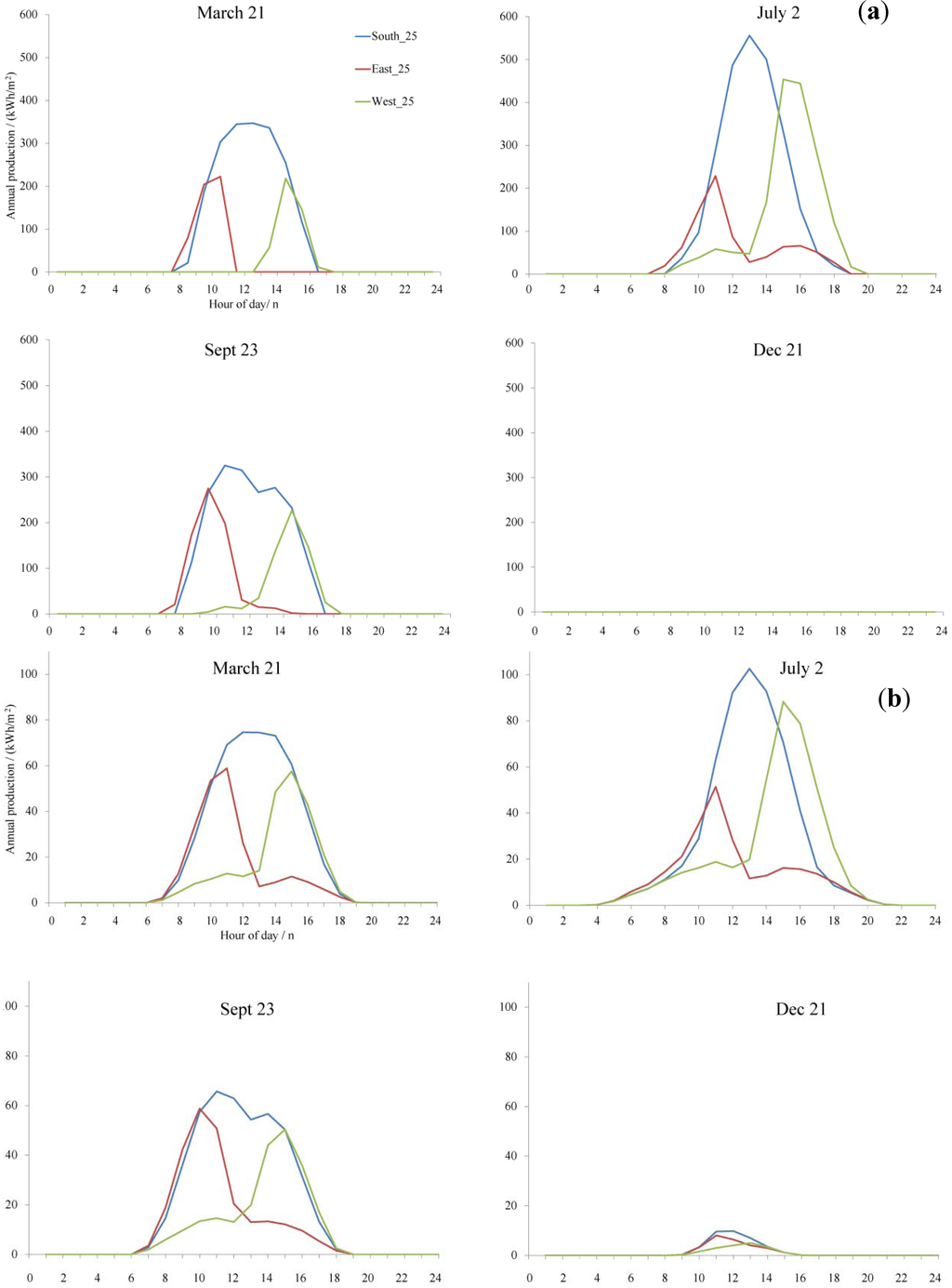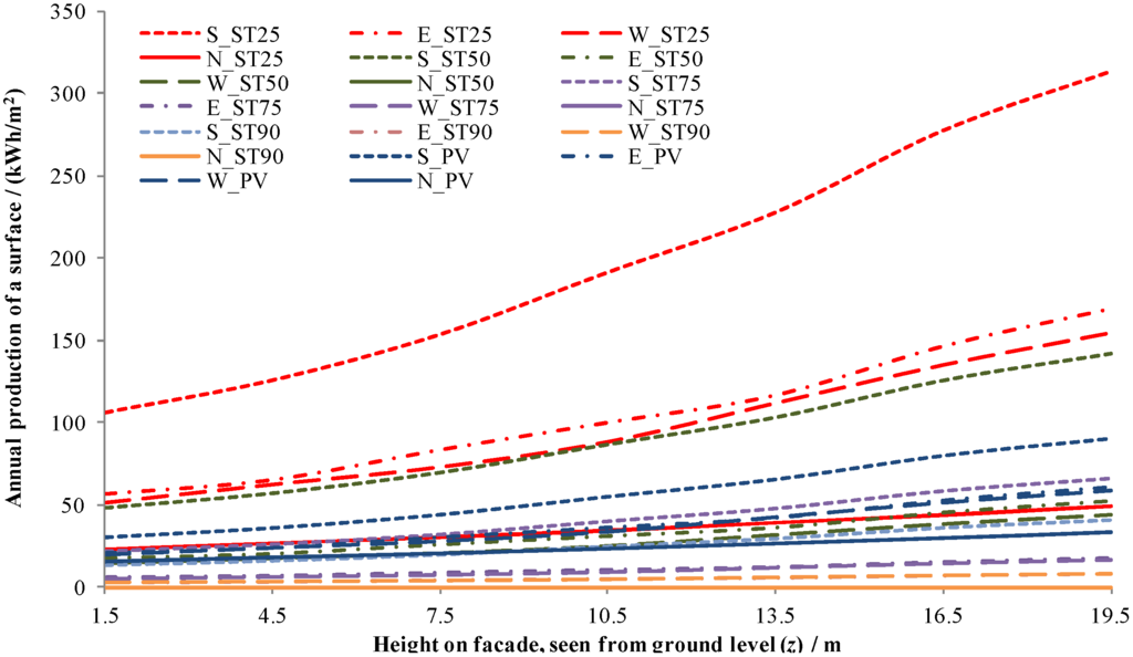 - The difference between the solar thermal production at 25 °C and ST with the other system temperatures and PV is significant. For example, at z = 19.5 m, the ST production at 25 °C is 314 kWh/m2a, the production of ST at 50 °C is 45% of this value, at 75 °C, it is 21% of this value, at ST 90 °C, 13%, and for PV, the production corresponds to only 29% of the ST 25 °C production. Note also that the ST production (25 °C) on East and West facades is higher than the PV production on the South façade;