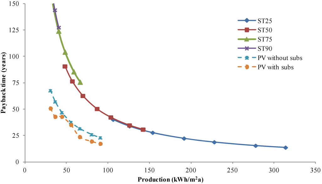 Considering that 25 years is a reasonable payback time, Figure 9 shows the following aspects: