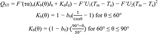 where, QST, useful output power of the ST system (W/m2); Kb(θ), incident angle modifier (–); F’(τα)n, zero loss efficiency for beam radiation at a normal incidence angle (–); Ib, beam irradiance (W/m2); Kd, diffuse angle modifier (–); Id, diffuse solar irradiance (W/m2); U, Heat loss coefficient [W/(m2K)]; Tm, Average temperature in absorber (°C); Ta, surrounding air temperature (°C).