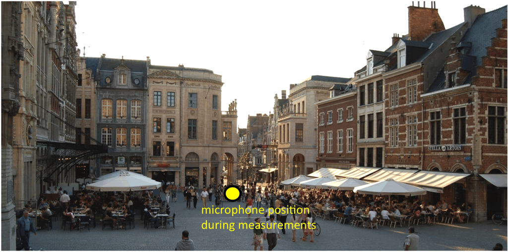 (1) A first set of calibrated binaural recordings was acquired in situ by using in-ear microphones (MS-TFB-2 Sound Professionals In-Ear Binaural microphones) and a solid state recorder, on a warm summer evening in the middle of the square surrounded by restaurants full of people. Measurements were done during 15 min on 5 different positions (randomly chosen between two restaurants, about 3–5 m from each other). Since there was not a large difference found between the positions, only one position was taken for comparison with simulations (Figure 1 and Figure 3—position 1). The recordings were performed in a period of the day when no buses were passing in the square, and analyzed in the laboratory in terms of their statistical noise levels and Leq values.