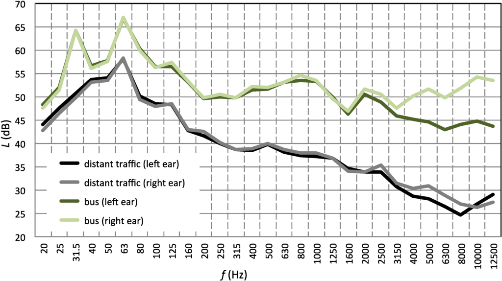 One third of an octave spectrum of distant traffic noise (as measured for left and right ear channel) and a passing bus (as measured for left and right ear channel).