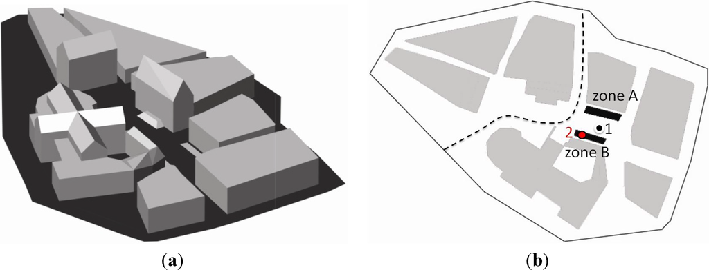 Geometric 3D model of Grote Markt including surrounding buildings (a) and the ground plan of Grote Markt with an indication of the outdoor restaurant zones A and B, and of the two listening positions: 1. in the middle of the square; 2. at the table in the restaurant. The dashed line indicates the trajectory of the buses (b).