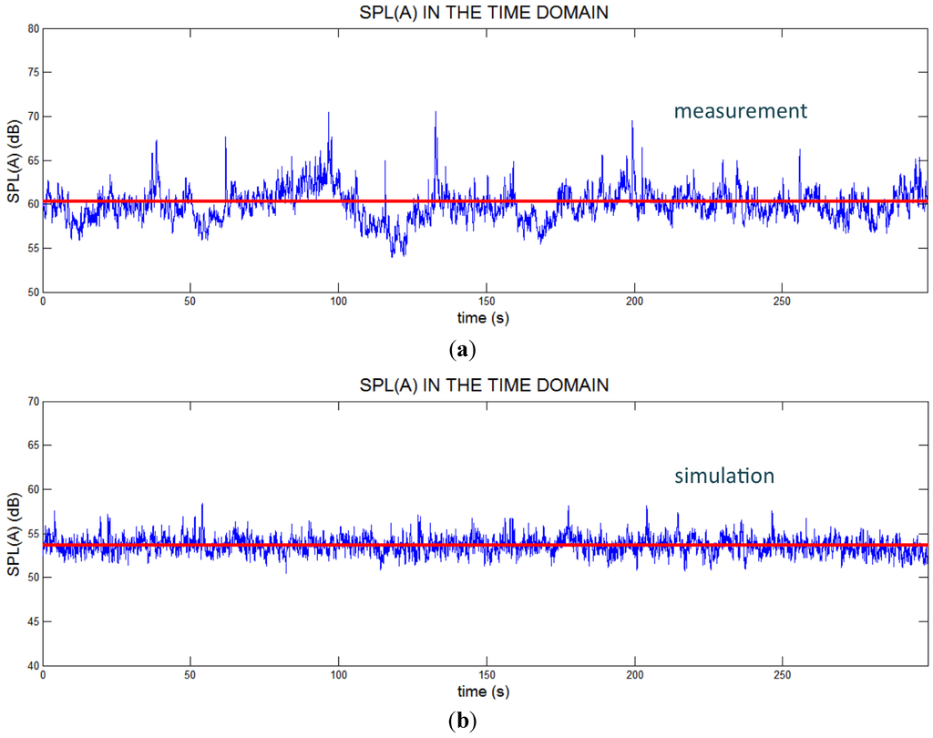 Comparison of the temporal structure of the measured (a) and simulated (b) sound pressure level in the square.