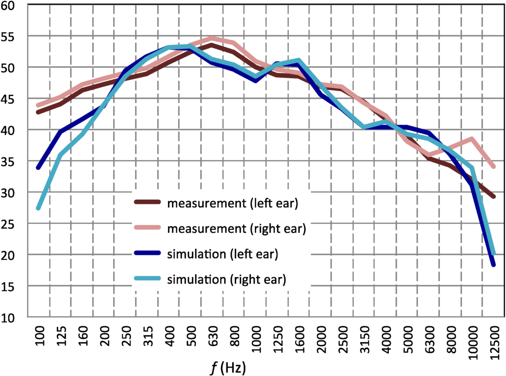 The binaural recordings were performed by in-ear microphones and an M-Audio® solid state recorder (Cetacean Research Technology, Washington, DC, USA ) with sampling frequency 44,100 Hz and a dynamic range of 24 bits. The recording system was calibrated in an acoustic laboratory in order to calculate correct absolute sound pressure levels from all recorded samples. The calibration was performed in the diffuse field (reverberant room) at 10 different positions of microphones and one position of omnidirectional point sound source (BK 4295) at three different sound pressure levels 60, 70 and 80 dB. The calibration file used for the analysis of sound pressure levels in 01dB Software was a pink noise recording of 80 dB. The calibration was later double-checked in free field (anechoic room) conditions by placing in-ear microphones on a stand at known distances 4 and 8 m from the same sound source (BK 4295 OmniSource, Bruel & Kjaer, Nærum, Denmark).