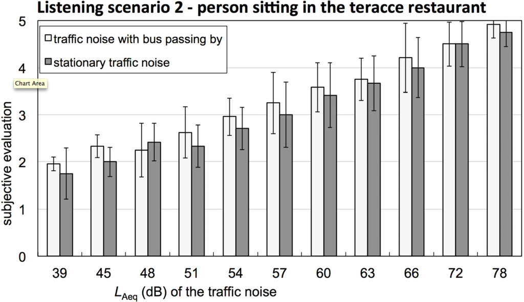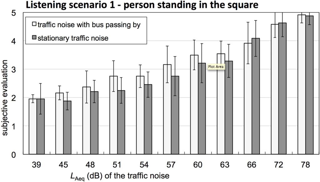 Statistical analysis in ANOVA-repeated measures gave the following results. No statistical difference was found between the two listening scenarios LS1 and LS2. Apparently there is no difference in perception of the noise level in the square if a person sits in the restaurant or when he/she is waiting in the middle of the square. The absence of effects of a listener’s activity on his or her perception could be caused by the fact that people in the laboratory (in a certain state of mind and without actually being on the square, cannot adequately “imagine” the situation with high precision.
