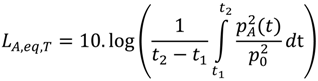 where pA is the instantaneous A-weighted rms sound pressure at time t, p0 = 20 μPa is the reference sound pressure level, T = t2 − t1 is the measuring period.