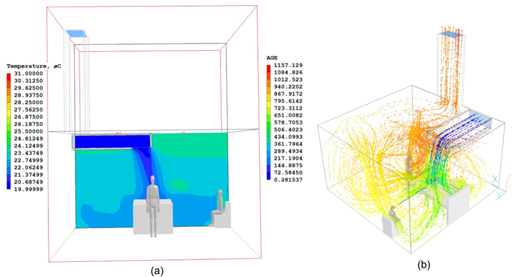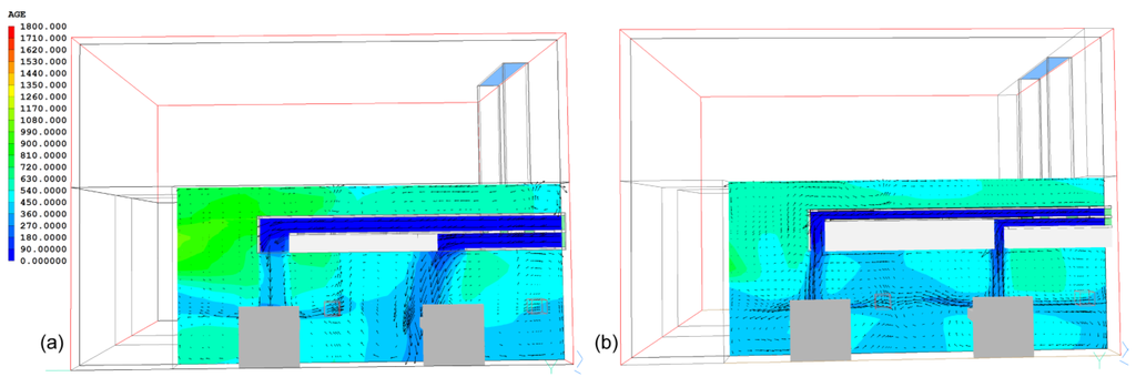 Age of air (τ) is another metric, used to evaluate the quality of air because it indicates the time spent by air particles since entering a space []. In simple terms, Age of air determines the relative freshness or staleness of air, making it helpful for this kind of study. The predictions of percentage of people dissatisfied due to draught (PPDR) is based on PHOENICS’ implementation of ISO 7730 for Class I buildings [] also described in Awbi [].