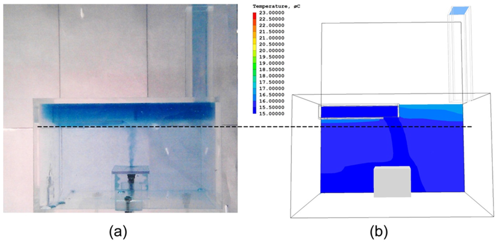 In the original NPV system, an elevated duct delivered fresh outdoor air directly over a patient in a single-bed ward (Figure 1a). In the process, the ingress of contaminated air into the patient’s breathing zone and overall bed area is minimised. The NPV also achieved a mixing regime for the entire ward because of the subsequent rising of warmed (buoyant) air and its escape via a stack whose point of discharge was higher than the duct’s inlet (Figure 1b). Follow-up investigation was carried out to validate the performance of the NPV using a scaled (1:20) Perspex model of the single-bed ward using salt-bath experimental modelling []. The flow regime was confirmed for interface layers (Figure 2) including the formation of “eddies” around the air supply duct. The scaled experimental validation of the NPV confirmed the descent of fresh air over the bed, the mixing regime as well as the tendency of fresh air to be “thrown” horizontally in a forward direction, which is a known characteristic of cold jet of air entering a warm space [,].