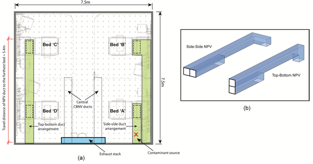 For the NPV system in the ADB ward, four ducts (each measuring 0.3 m × 0.6 m in cross section) and two supplementary ducts (each measuring 0.4 m × 0.7 m) were used for fresh air supply. The total area of air inlets was therefore 1.28 m2 which is 53% more than total area of window openings. Due to the need to ensure fresh air was supplied to the exact location on each of the four beds, two possible designs of the NPV system that were considered and modelled are: the Side–Side Duct Arrangement; and the Top–Bottom Duct Arrangement (Figure 3). The three-dimensional positions of the Side-Side and Top–Bottom NPV ducts along (Figure 3b) represent the distinct feature of the NPV cases being investigated for the ADB ward. The clear headroom and height of opening for each duct in the Side–Side arrangement was 2.45 m while for the Top–Bottom arrangement, the headroom was 2.15 m. The exhaust stack was proportionately sized in cross section as 1.28 m2, representing 1% of the net floor area as done in Lomas and Ji [] for sizing advanced natural ventilation systems. The central exhaust stack was located internally along the external wall (Figure 3a) to ensure balanced access of stale to the exterior. The stacks were assumed to rise up to 2.5 m above the roof level. The longest ducts meant for the furthest beds were required to span a distance of 5.4 m (Figure 3a).