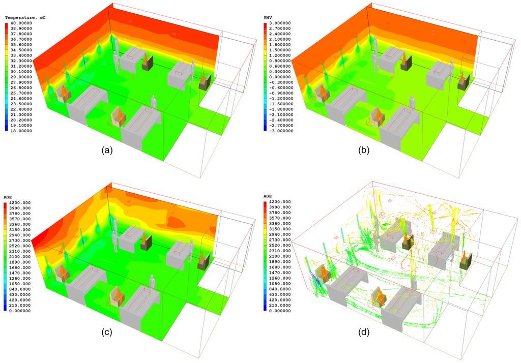 Airflow characteristics of the base case design showing contours of: (a) Temperature; (b) PMV; (c) Age of air; and (d) Streamlines of displaced air particles as they flood the space.