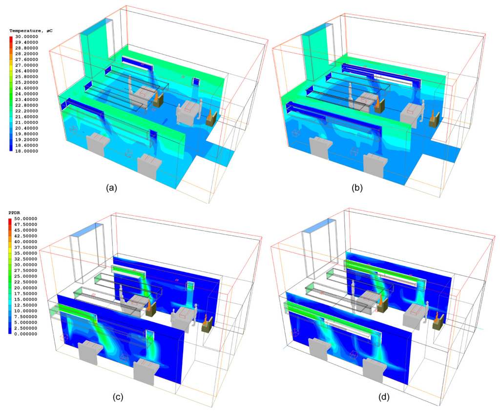 For the Side–Side NPV design in ADB ward, the predicted PPDR values are between 15% and 24% (Table 3). The lower PPDR values belong to the longer ducts which have elbows, leading to lower air velocity for Beds B and C. Due to pressure loss at these bends, these beds (which are furthest from external wall) are expected to experience lesser draught (Figure 5c) than Beds A and D. The less draughty beds (B and C) are therefore warmer (i.e., based on PMV values), than Beds A and D.
