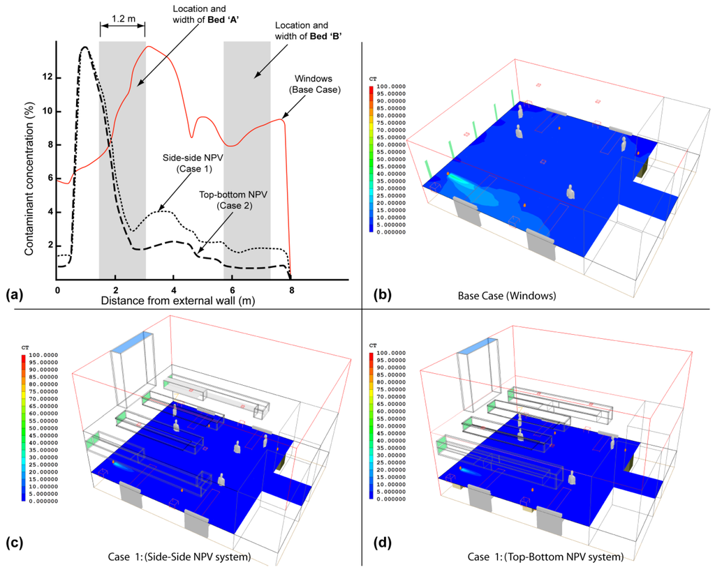 Contaminant removal efficiency (CRE) was estimated at assumed head position on all four beds as well as at standing height in the centre of the ward. The CRE for each position in the Base Case is significantly higher than at similar positions for Case 1 and Case 2 (Table 1). Although the NPV in Case 2 (Top–Bottom) offers relatively better CRE values than Case 1 (Side–Side), both systems are significantly superior to the CRE of Base Case, by a minimum order of 34.4% (Bed C, in Case 1) and a maximum order of 80% (Bed D in Case 2).