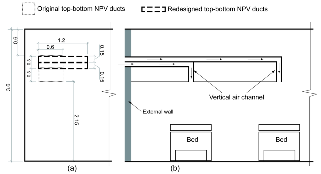 The design of the NPV system integrates architectural layout (e.g., bed locations and height of headroom) with natural ventilation principles as earlier demonstrated in the original study of the NPV []. For this study, these integrated design factors are described in the next sub-sections.