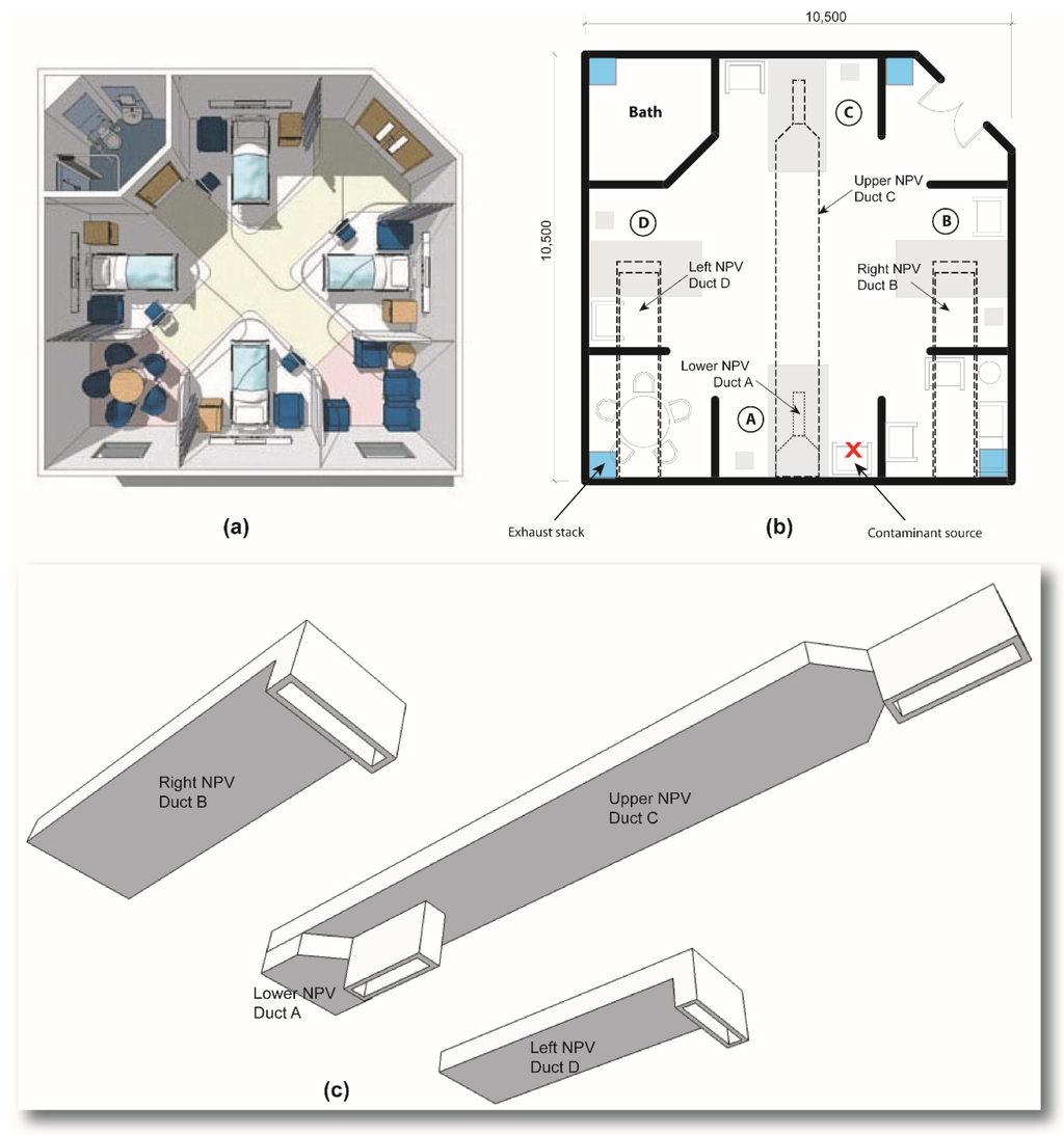 To further test the scalability and adaptability of the NPV system to different design scenarios, an alternative four-bed ward (Nightingale Cruciform ward) developed by an architectural practice was modelled and simulated. This ward had significantly different spatial and bed layout requirements. The next subsections describe the NPV design considerations and the results obtained from the simulations carried out.
