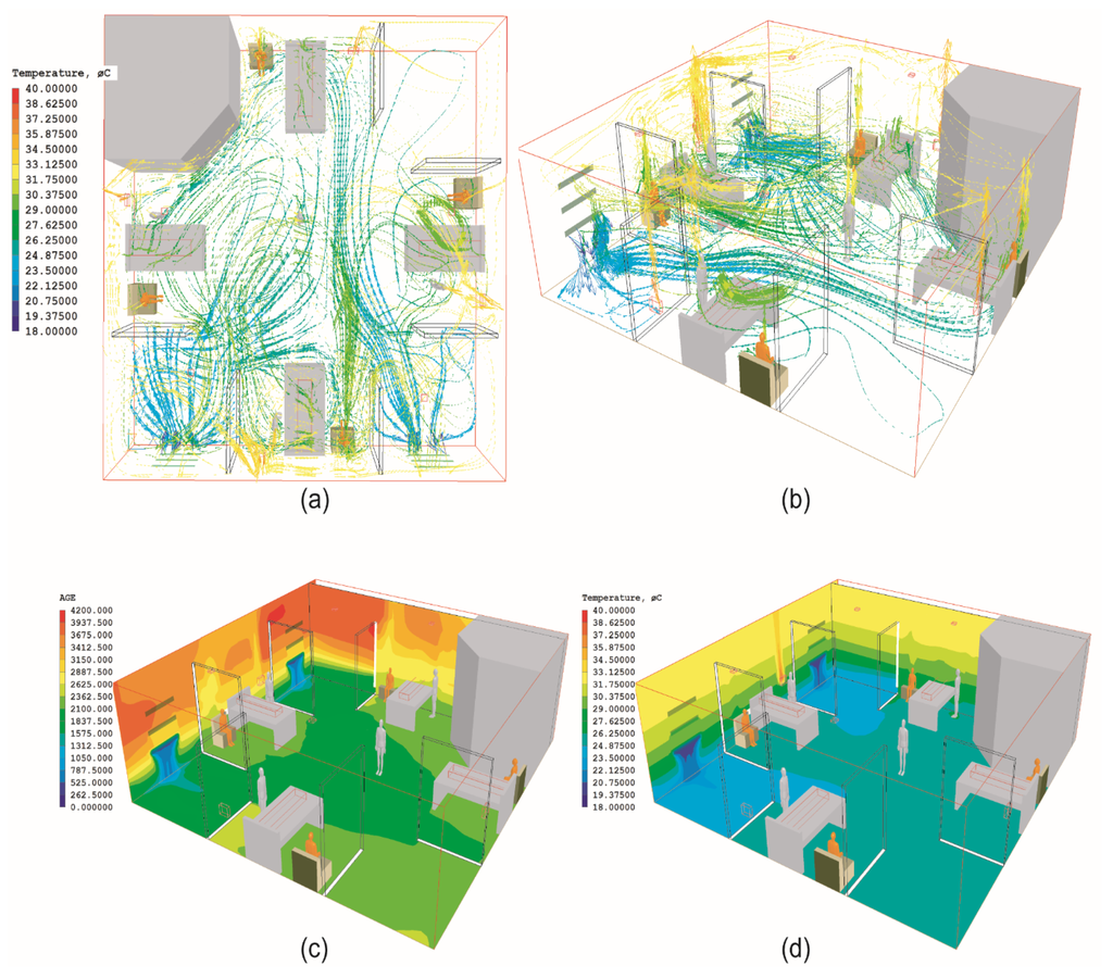 Airflow characteristics in Cruciform Ward showing pattern and direction of air movement in: (a) Top view; and (b) Isometric view; with contours for (c) Age of air; (d) Stratified temperature.