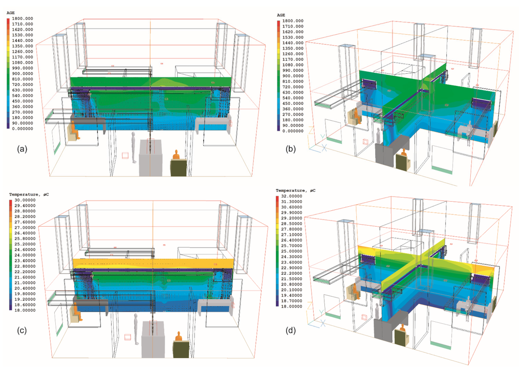 The Cruciform Ward: contours and vectors for age of air shown as: (a) Side view; (b) Isometric view; and for temperature (c) Side view; and (d) Isometric view.