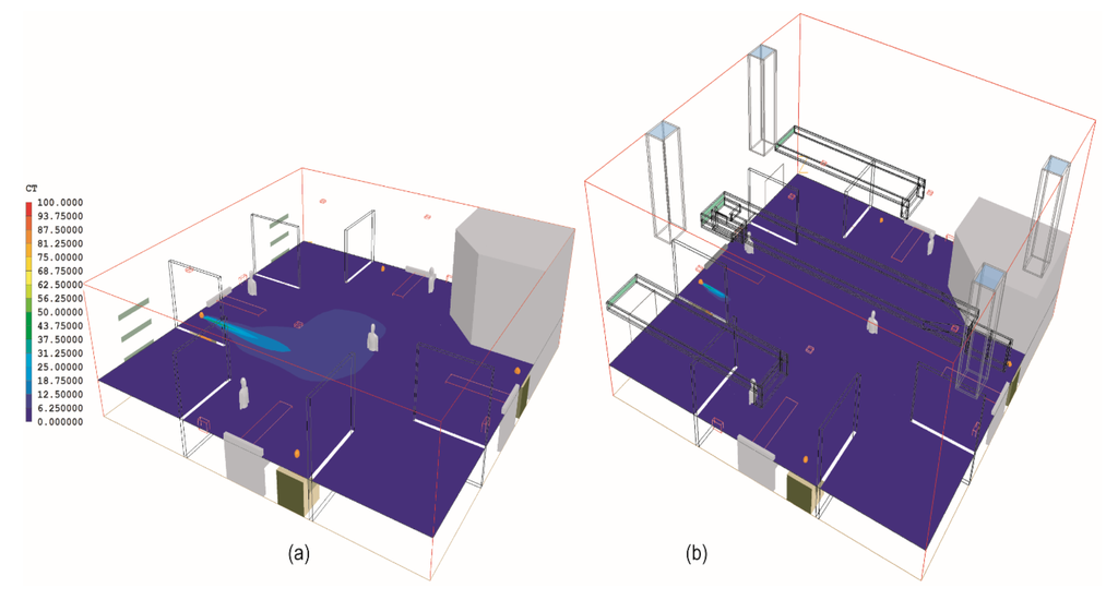 Differences in distribution of passive scalar airborne contaminants in Cruciform Ward based on: (a) Window design; (b) NPV system design.